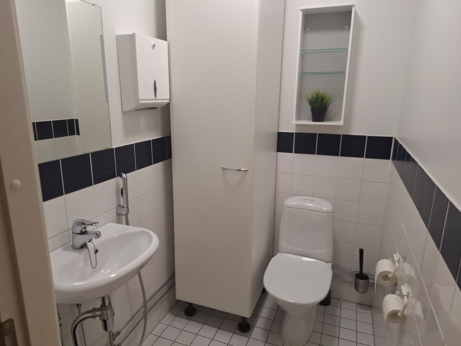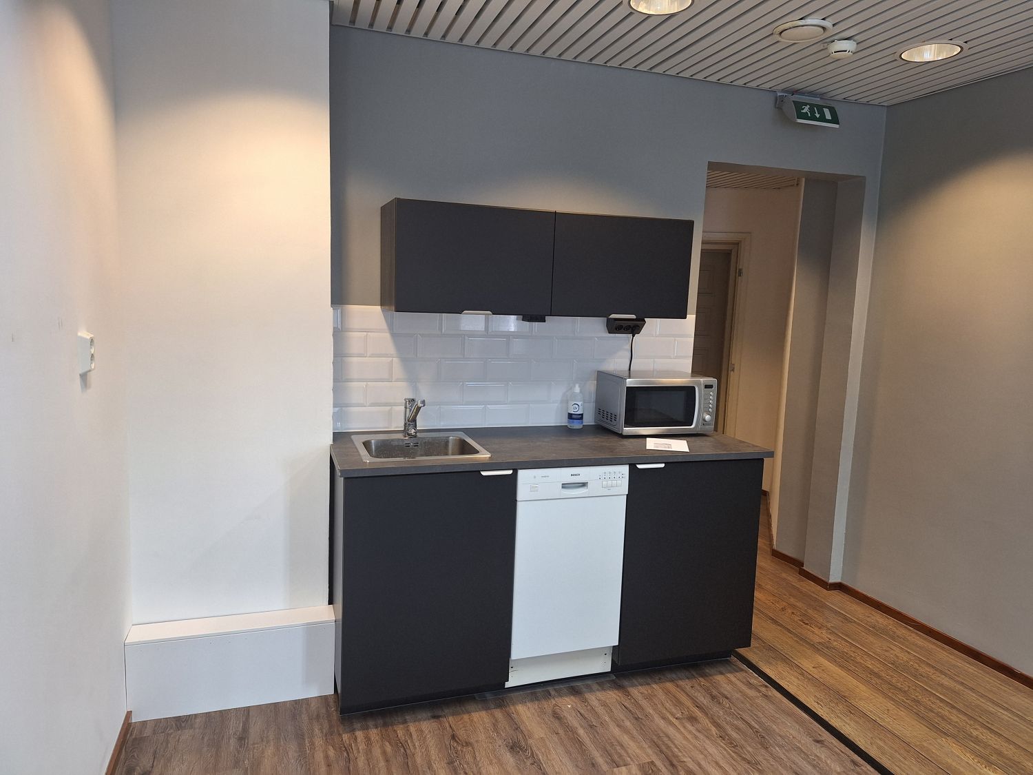 Avoin tila, 1 (neuvottelu) huone, minikeittiö, 2x wc, aula.