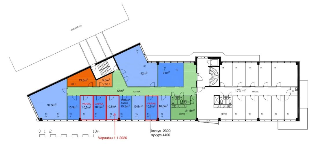 Kiinteistön toisesta ja kolmannesta kerroksesta vuokrattavana pientoimistoja 10,5-11 m² ja 37,5 m². Tilat ovat valoisia, siistejä ja varustettu tuloilman jäähdytyksellä sekä koneellisella ilmanvaihdolla, mikä takaa miellyttävän työympäristön ympäri vuoden.