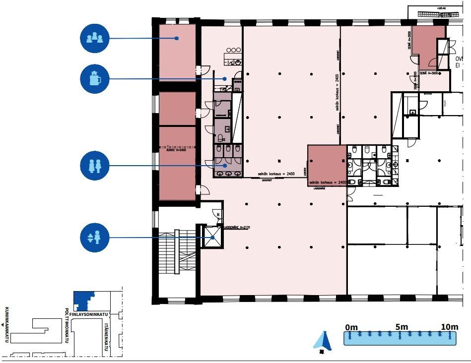 Toimistotilaa kolmannen kerroksen kolmeen suuntaan avautuvilla näkymillä. Tila on tällä hetkellä jaettu kolmeen suurempaan toimistoalueeseen, joiden lisäksi on muutama neuvotteluhuone. Oma keittiö ja useampi WC. Tilaratkaisu suunnitellaan vuokralaisen tarpeen mukaan.