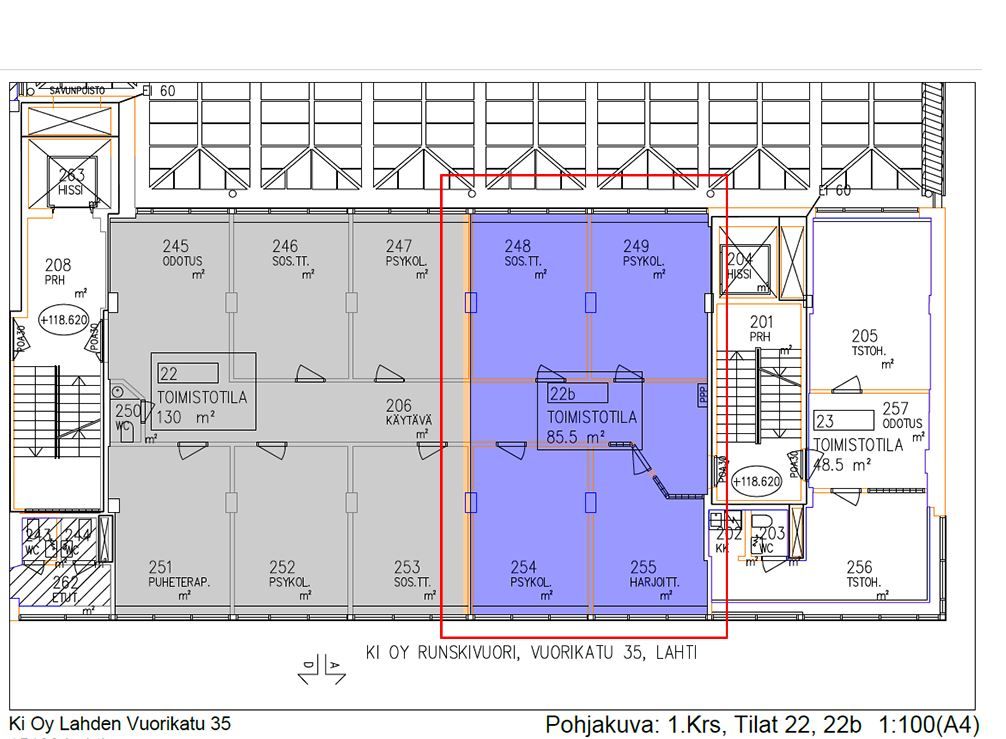 Siisti toimistotila, jossa on useampi erillinen huone.