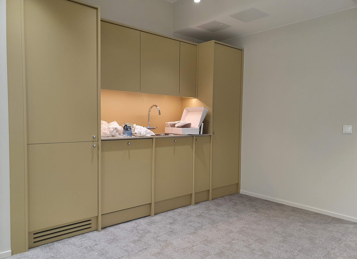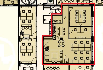Avotilan lisäksi pieni ja isompi lasitettu neuvottelutila, avokeittiö ja WC.