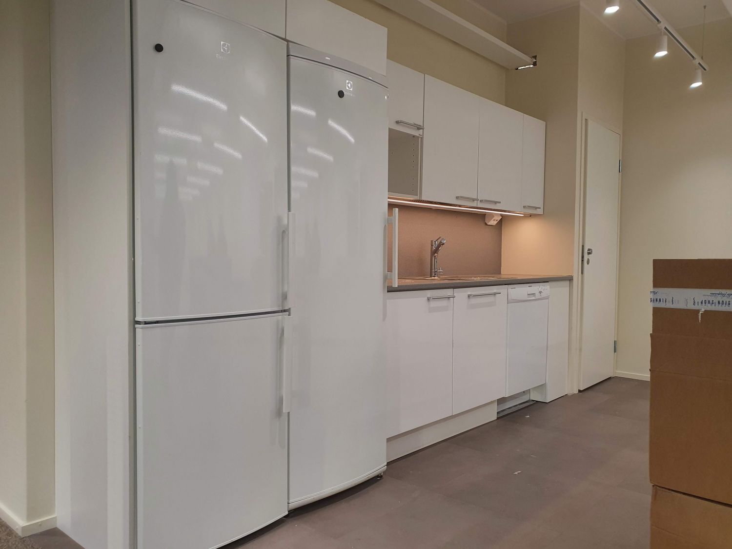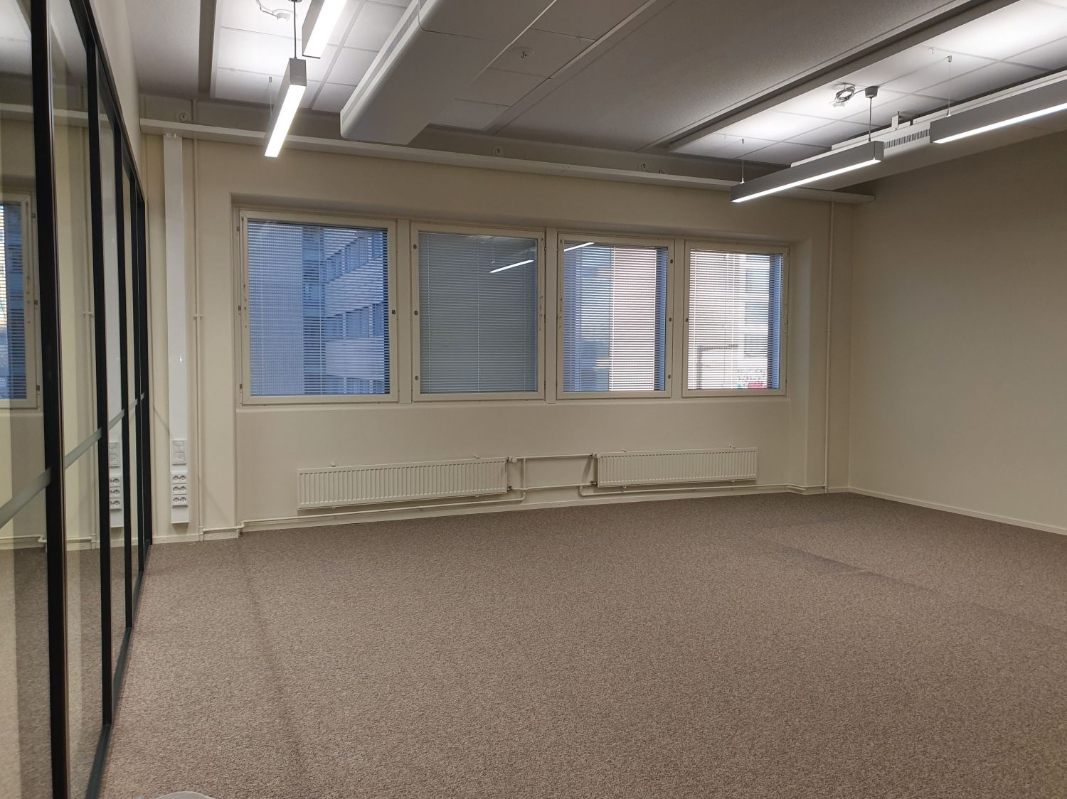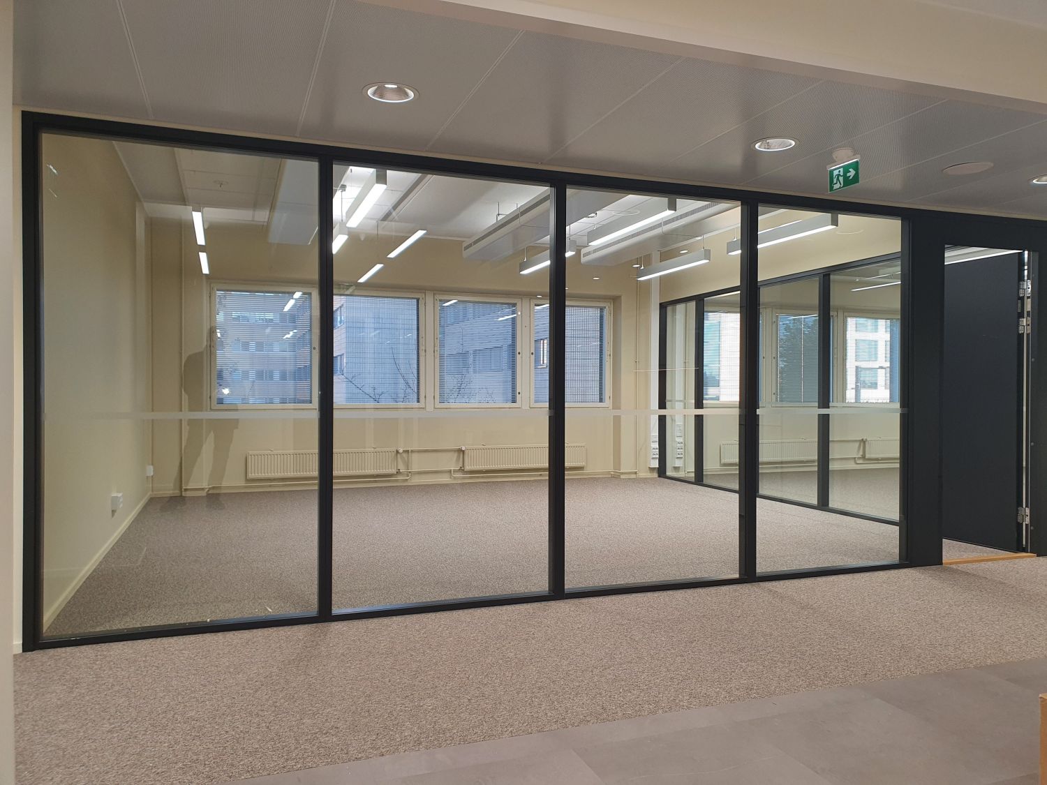 Avotilan lisäksi kaksi lasitettua neuvottelutilaa, avokeittiö saarekkeella ja kaksi WC-tilaa.
