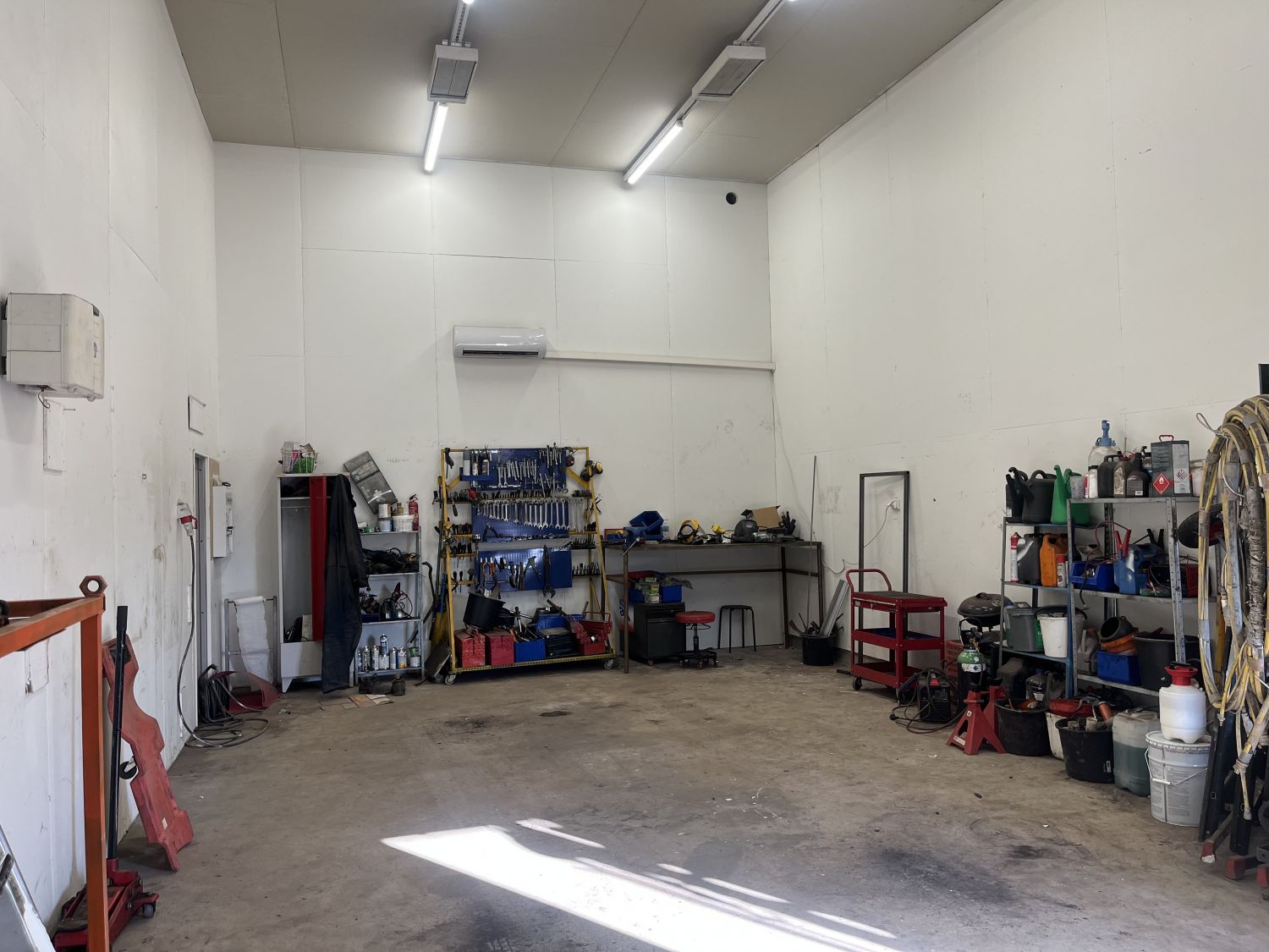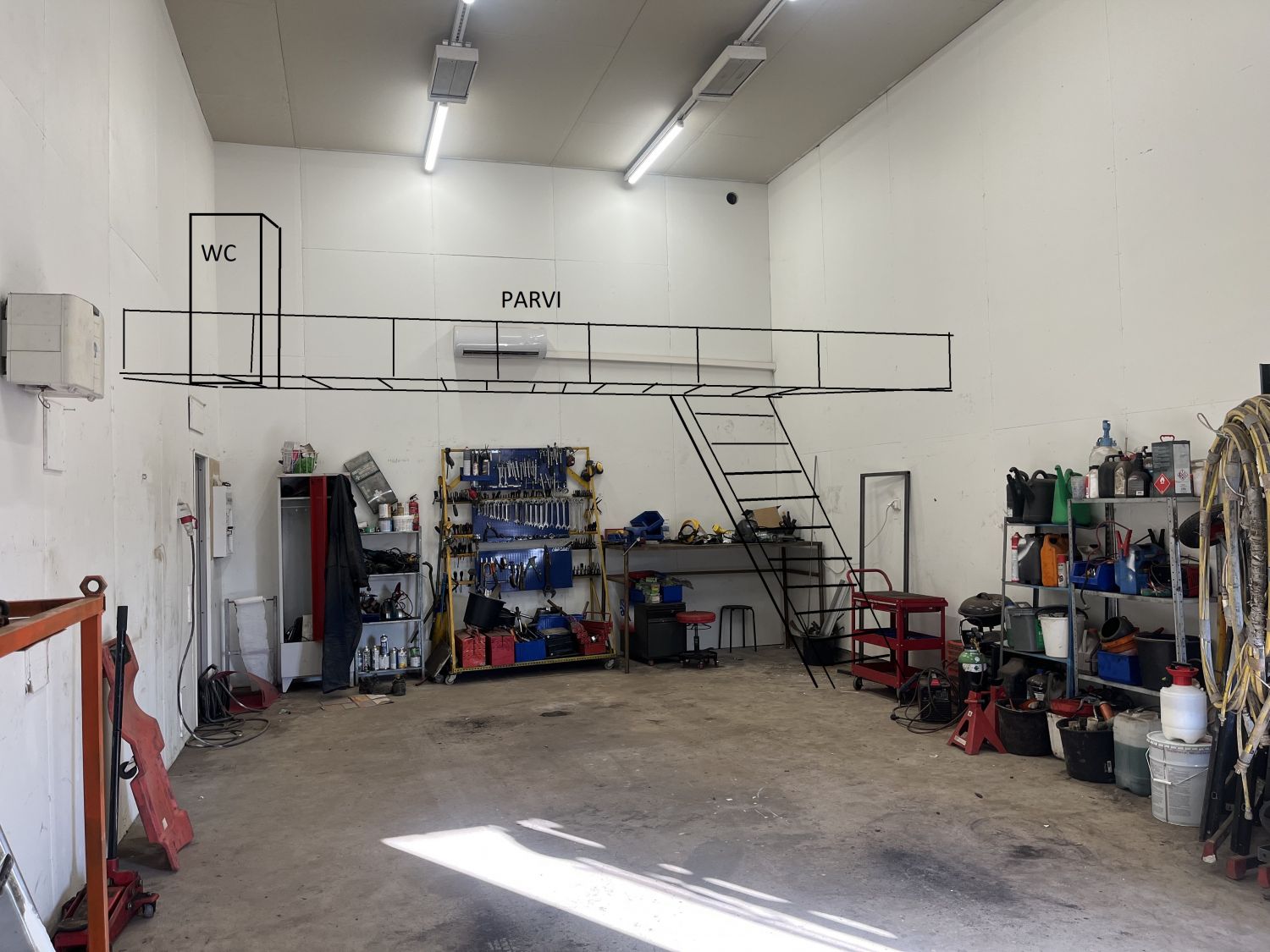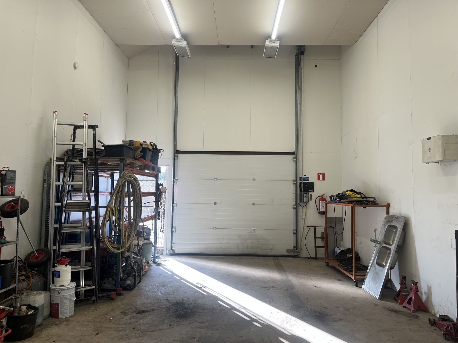 Pinnat maalattu, asennettu ilmanvaihto, ilmalämpöpumppu, sekä sähkötoiminen nosto-ovi.