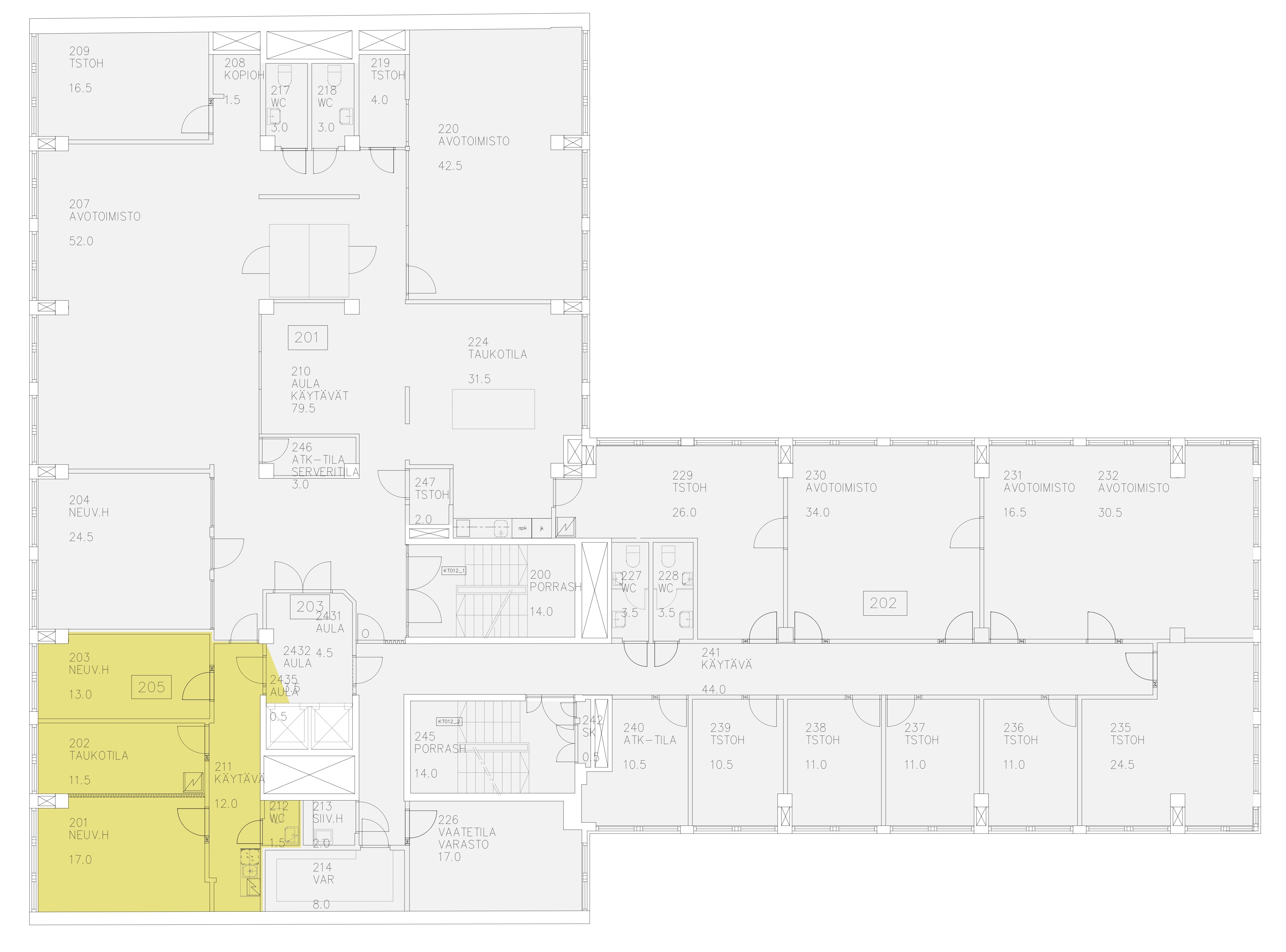 2. kerroksen siisti toimitila, jossa kolme huonetta, pieni keittiö ja wc. Tila on muokattavissa vuokralaisen tarpeisiin sopivaksi.