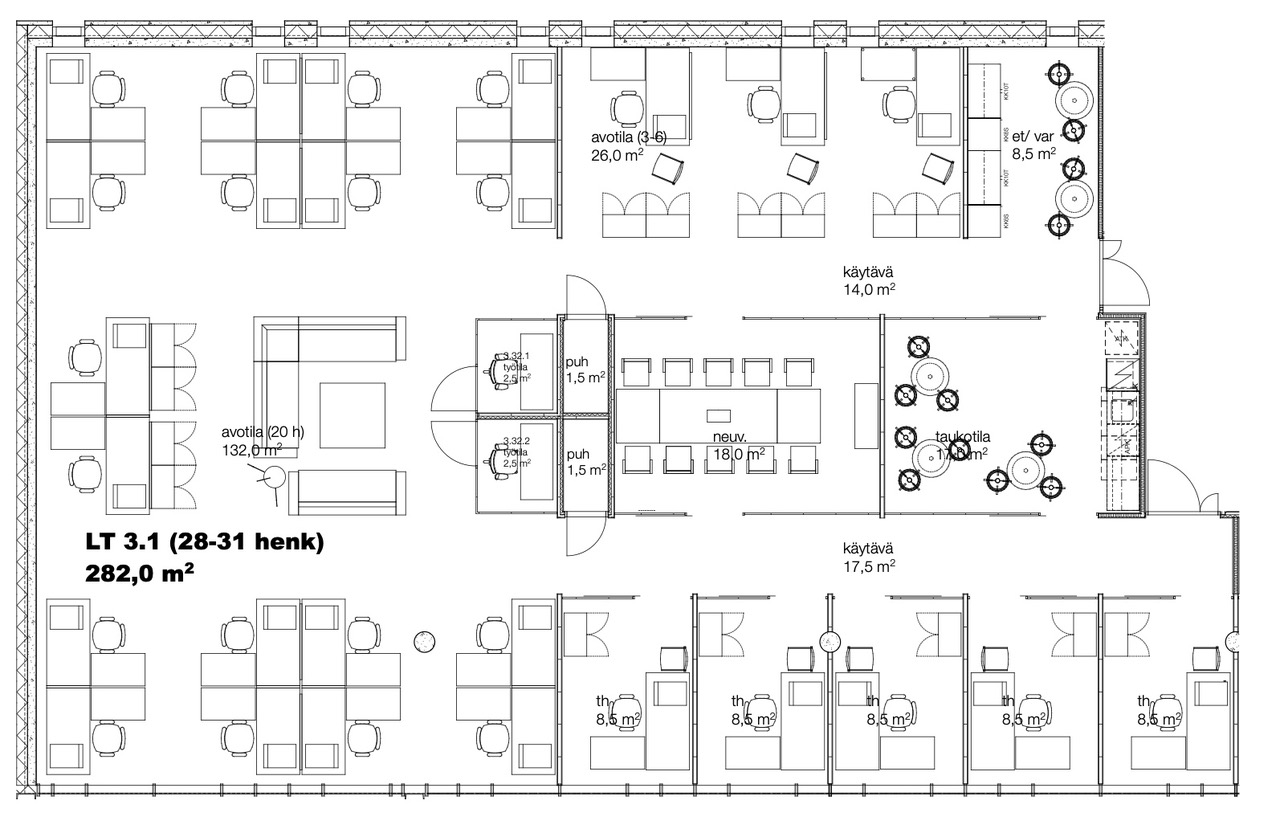 Selkeälinjainen ja muuntojoustava tila täyttää nykyaikaisen hybridityön vaatimukset ja soveltuu hyvin noin 6–31 hengen toimistoksi. Moderni toimistotila on toimiva yhdistelmä avotilaa, neuvotteluhuoneita, työhuoneita ja videoneuvotteluihin sopivia tiloja. Tila voidaan vuokrata yhtenä kokonaisuutena tai pilkkoa pienemmiksi toimistotiloiksi.