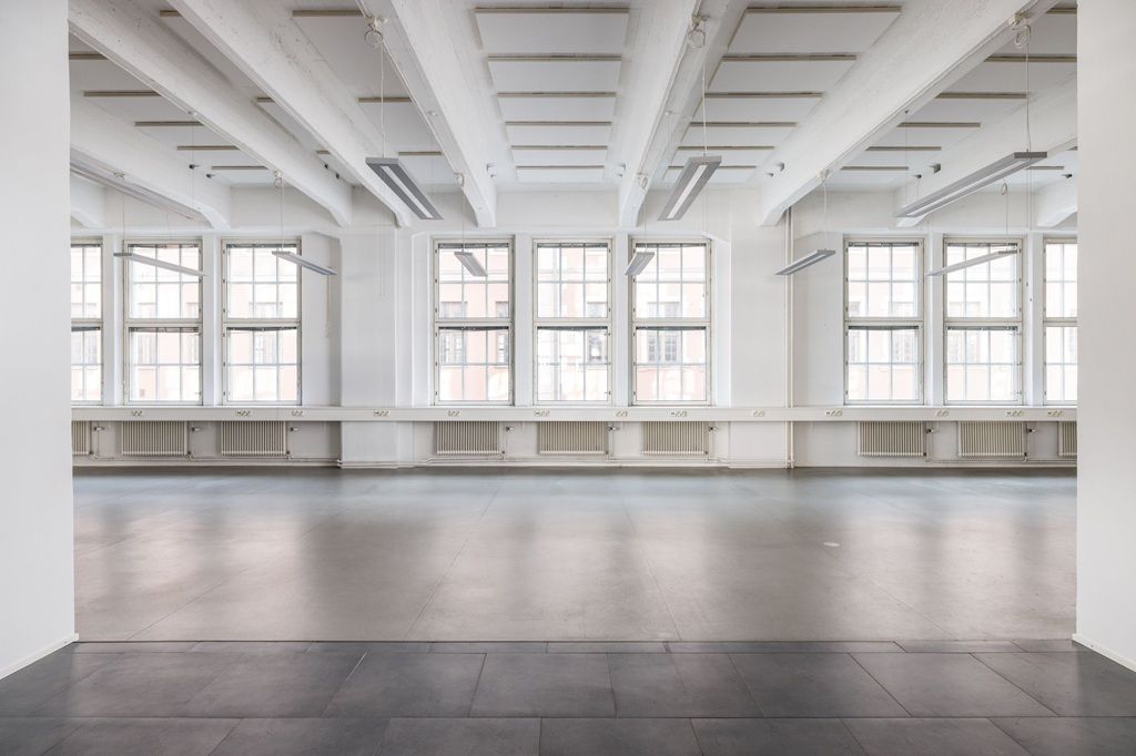Hieno industrial-henkinen tila, jossa korkea huonekorkeus.