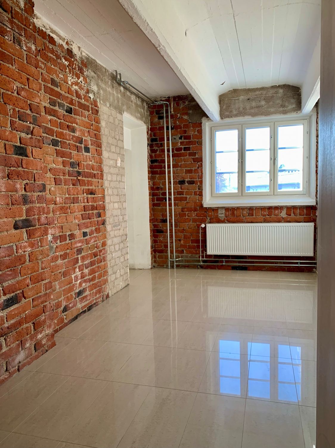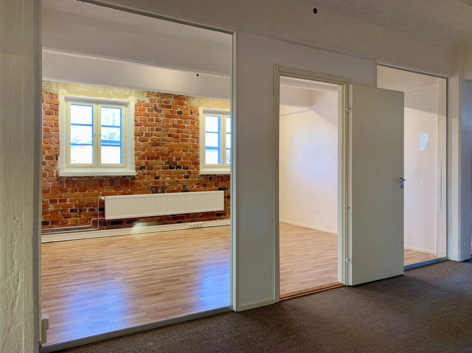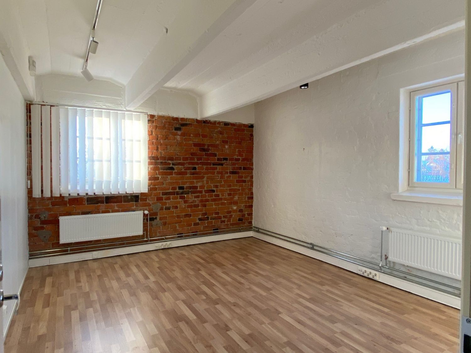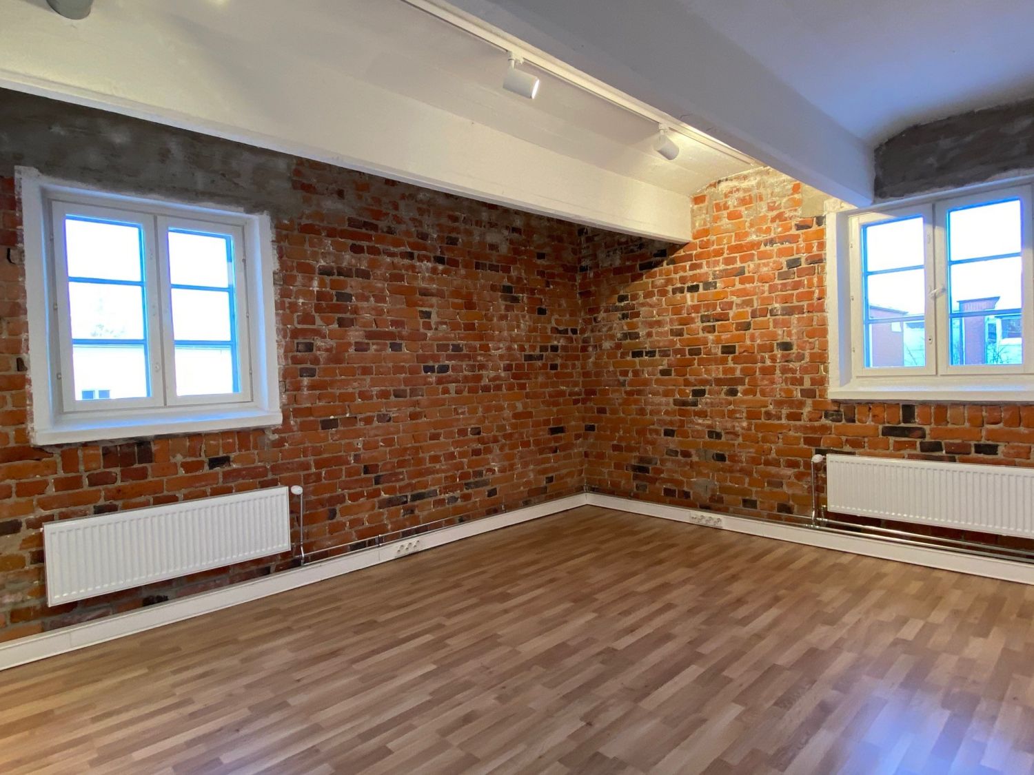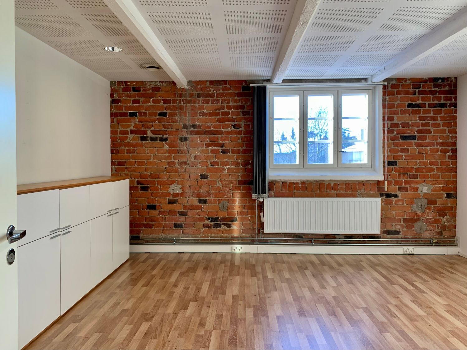 Persoonallinen huonetoimisto halutussa Hankkijantalon 3. kerroksesta. Punatiilipintaa puhdistettu näkyviin saneerauksen yhteydessä. Peräti 11 kpl isoja ruutuikkunoita kolmeen ilmansuuntaan.