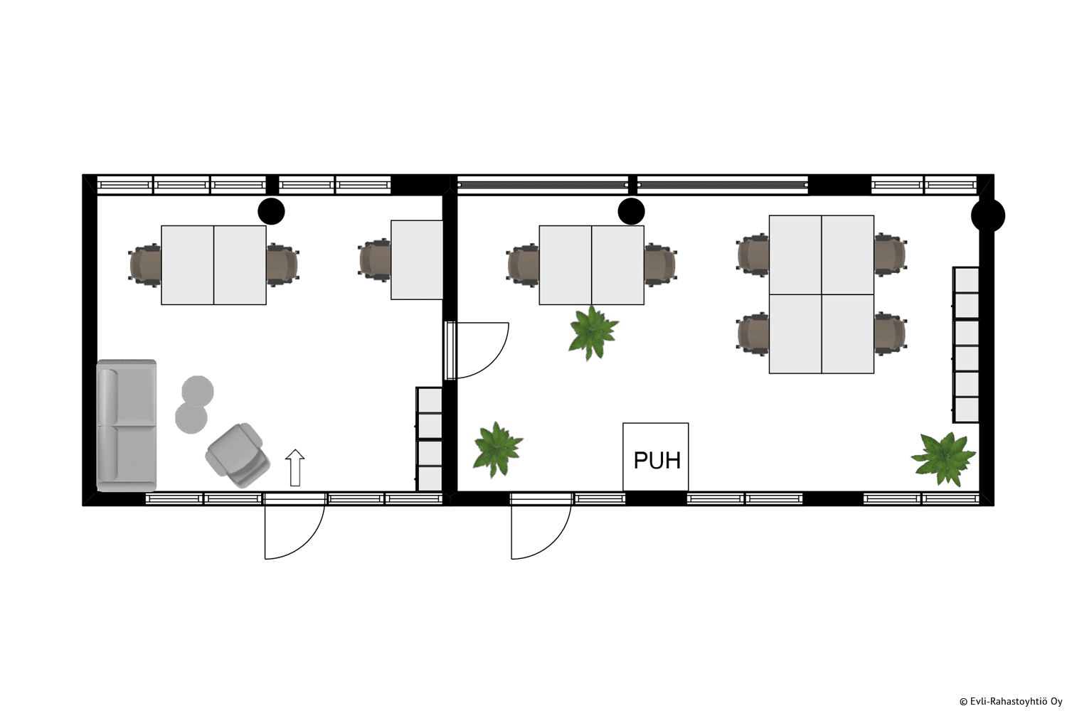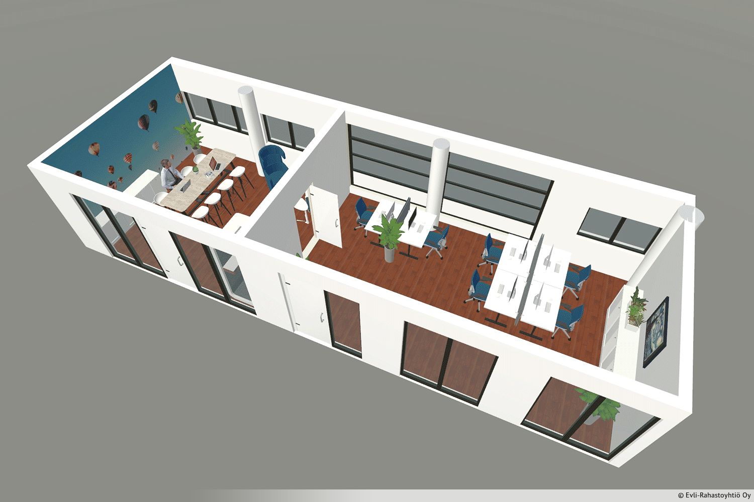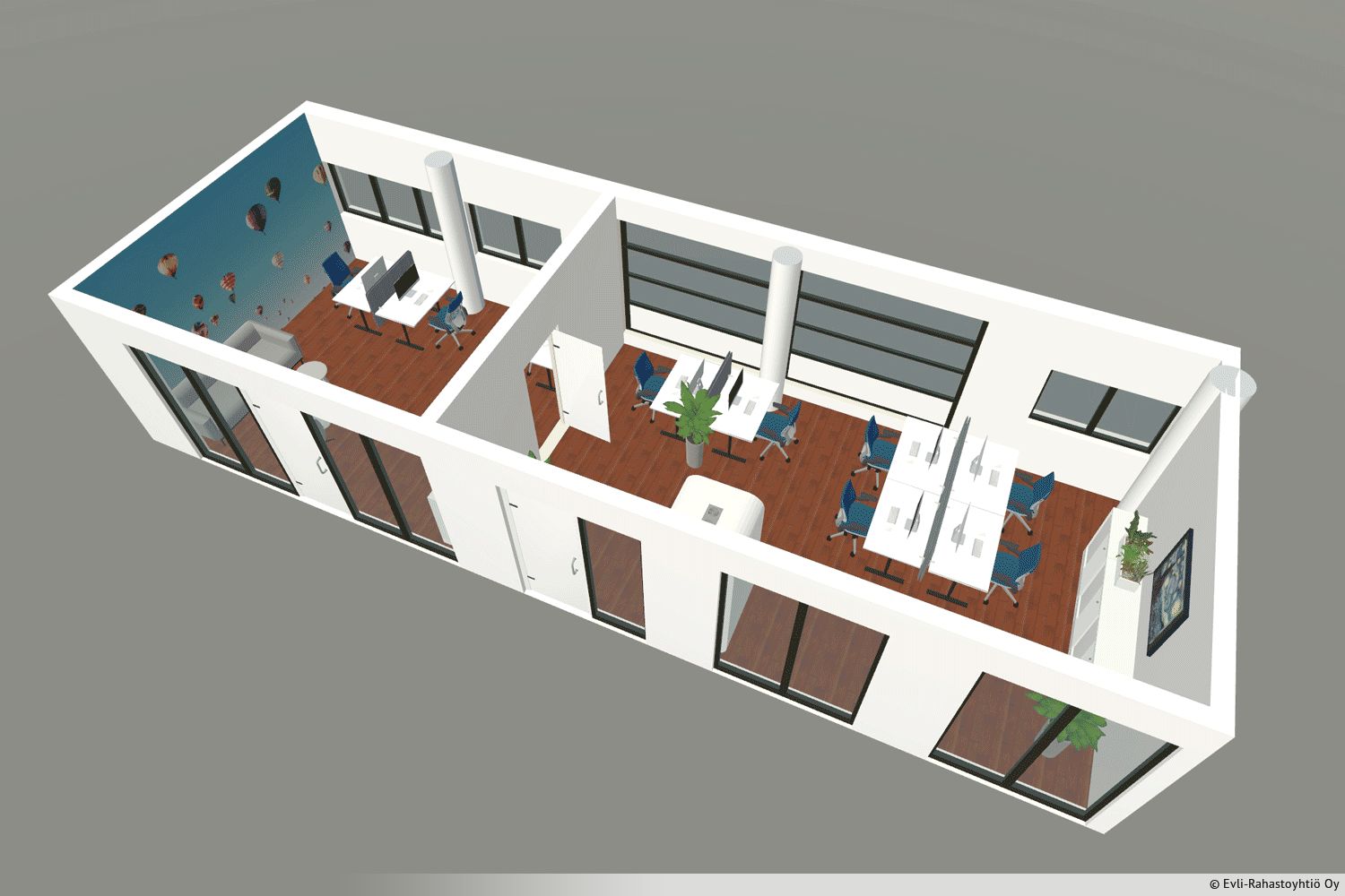Vuokrattavana kahden kookkaan toimistohuoneen kokonaisuus Espoon Toimistossa. Huoneiden välillä on ovi. Tiloihin saa tarpeen mukaan 4-8 työpistettä. Vuokralaisten käytössä on business parkin monipuoliset tukipalvelut. Ota yhteyttä ja kysy lisätietoja!
