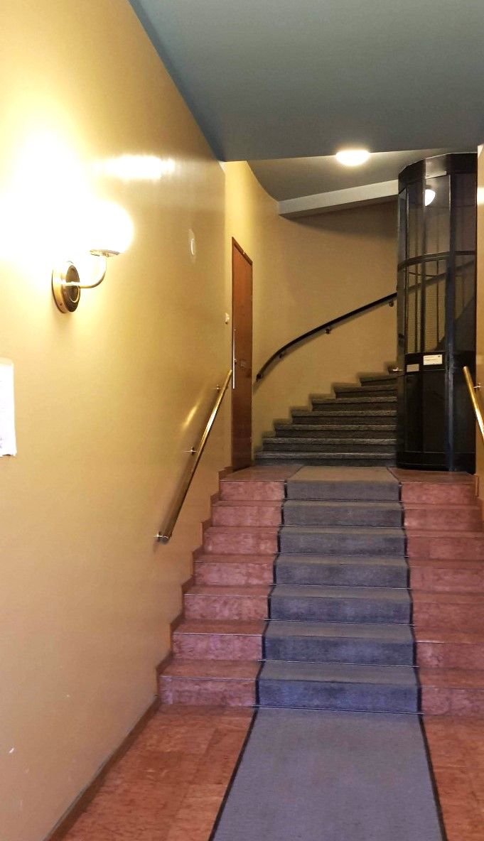 Huoneiston ikkunanäkymät Kivelänkadulle Scandic-hotellin suuntaan. Sisäänkäynti Mannerheimintien puolelta porraskäytävän kautta.