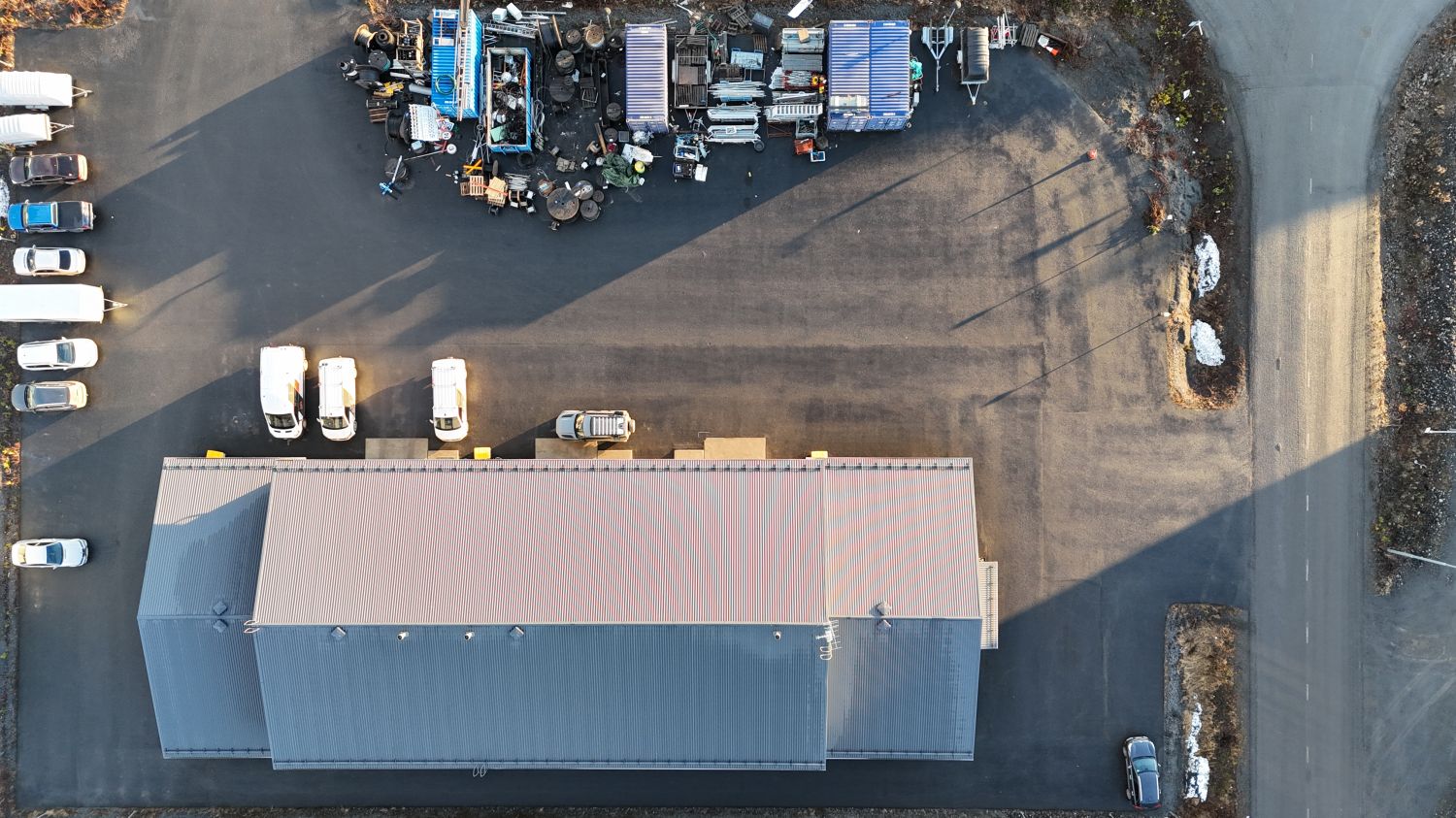 Päädyissä toimistot ja keskellä varastotilat. Tilava piha ja paljon parkkitilaa.