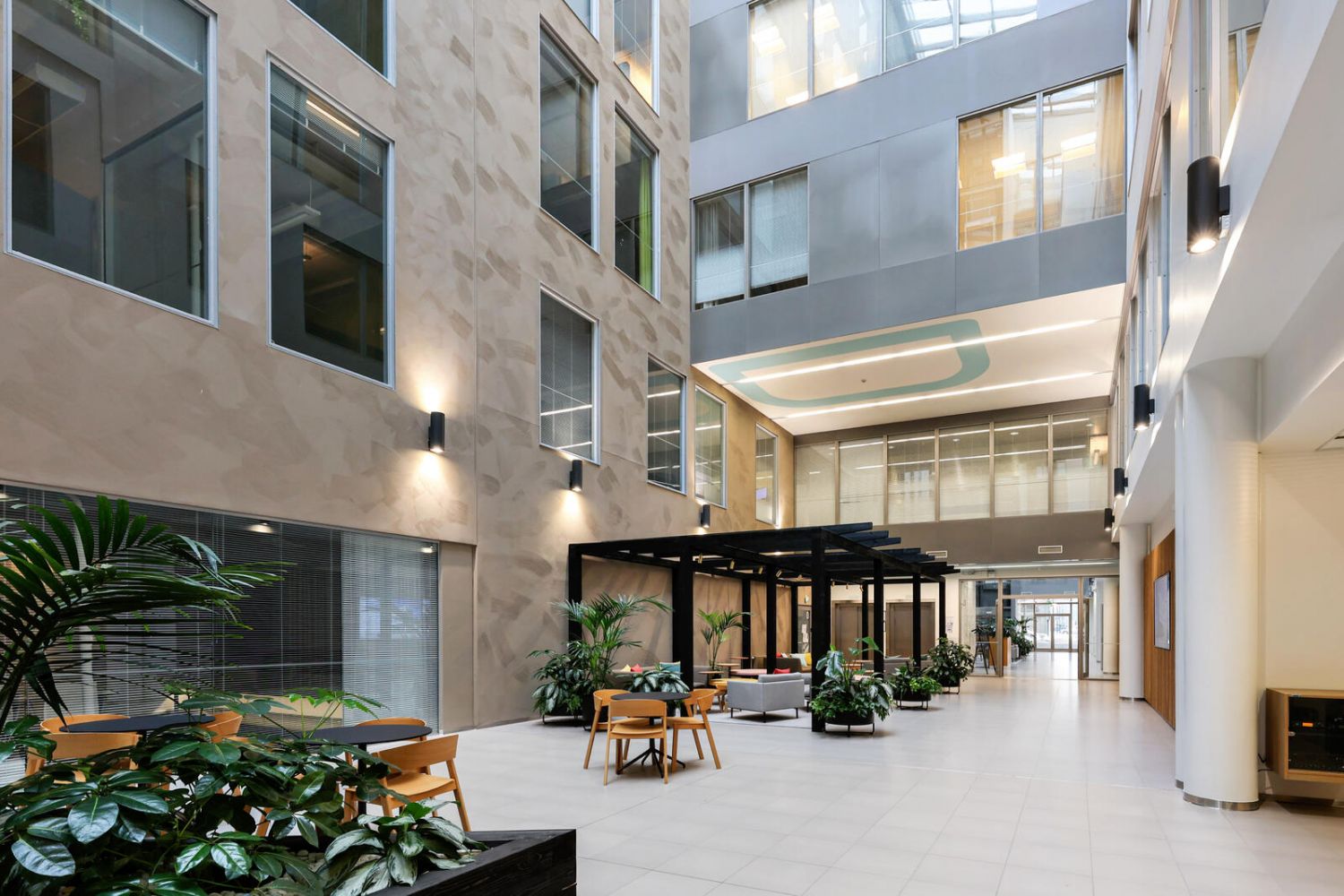 Viiden toimitilarakennuksen yhteiset tilat edesauttavat toimivaa arkea. Albergan yleisten tilojen ja kohtaamispaikkojen toimivuuteen ja viihtyvyyteen on panostettu aidosti. Yrityspuisto tarjoaa kaikki nykyaikaisen toimistokohteen palvelut, kuten aulapalvelu, vuokrattavat neuvottelutilat ja edustussaunatilat. Myös lounasravintola ja kahvila ovat lähellä, ja Kauppakeskus Sello sijaitsee kadun toisella puolella, täydentäen lähiympäristön palveluvalikoimaa entisestään.