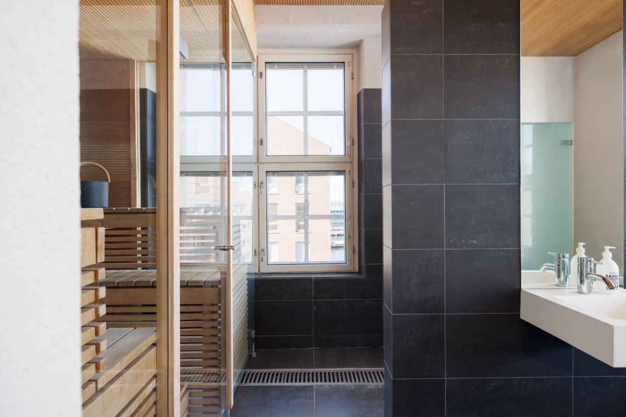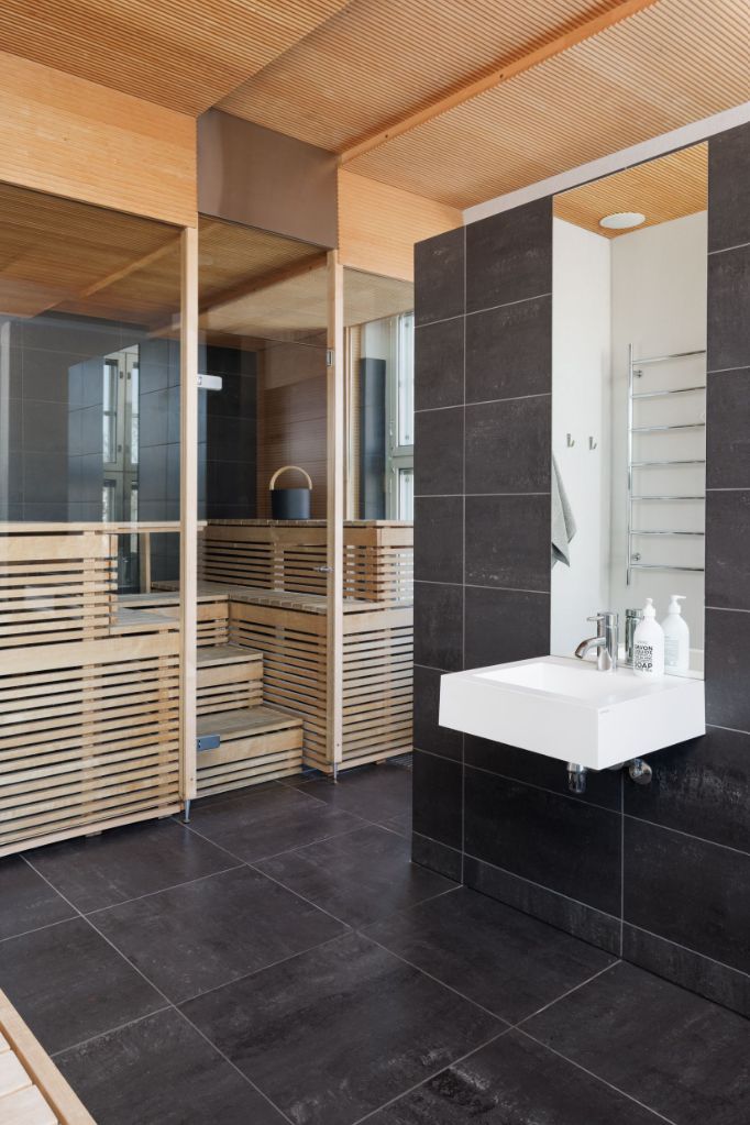 Pohjaratkaisu yhdistää avotilan ja lasiseinäelementein rajatut huoneet, mikä luo tilaan avaruutta ja modernia ilmettä. Modernin keittiön lisäksi lattiamateriaalit ovat tyylikkäät: puukuviota ja tummaa tekstiilimattoa, jotka tuovat lämpöä ja kontrastia tilan rouheaan tunnelmaan. Lisäksi tässä toimistotilassa on oma sauna.