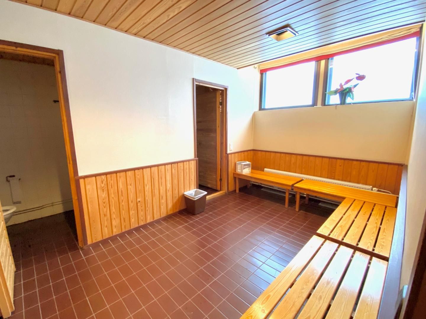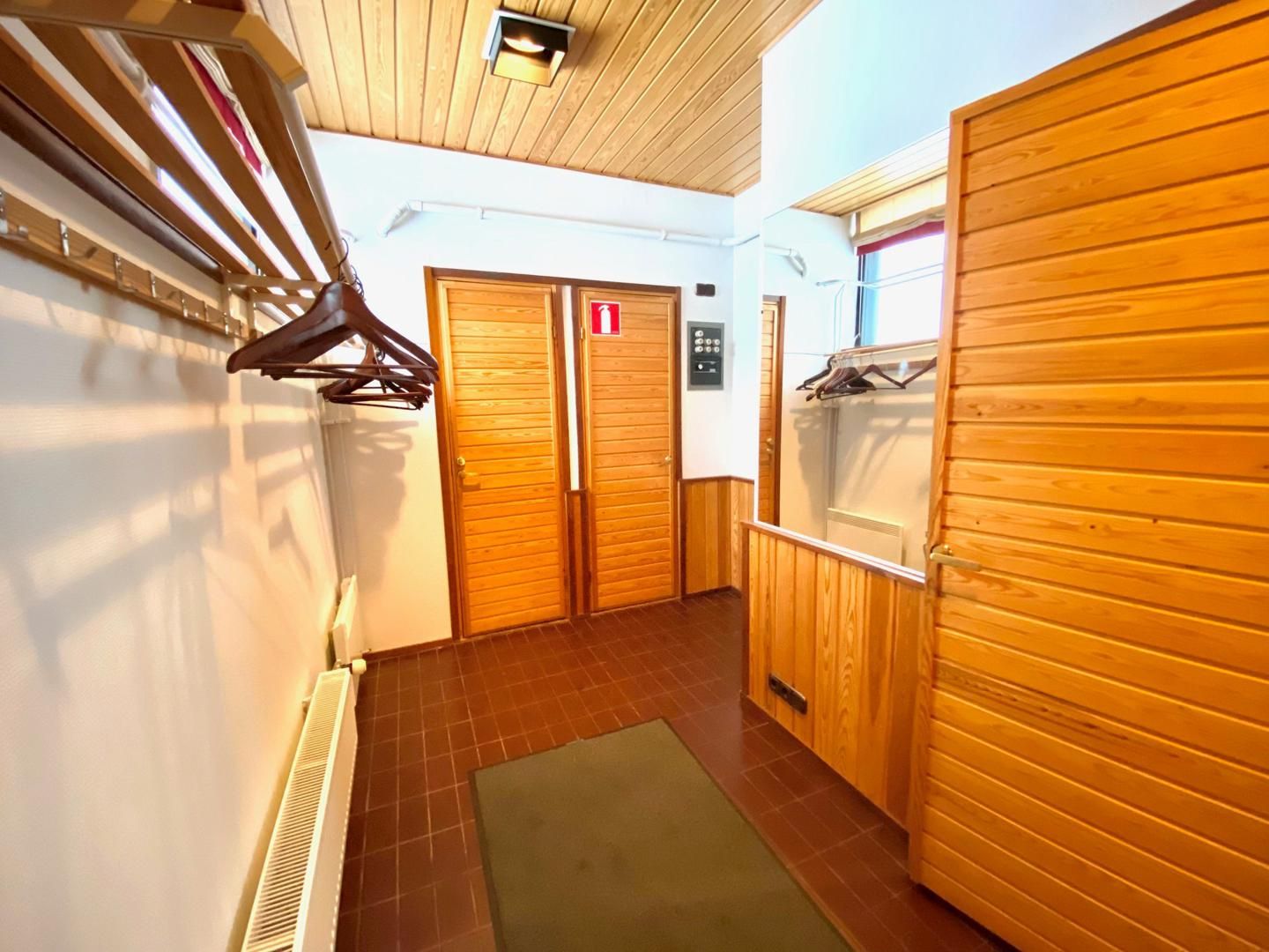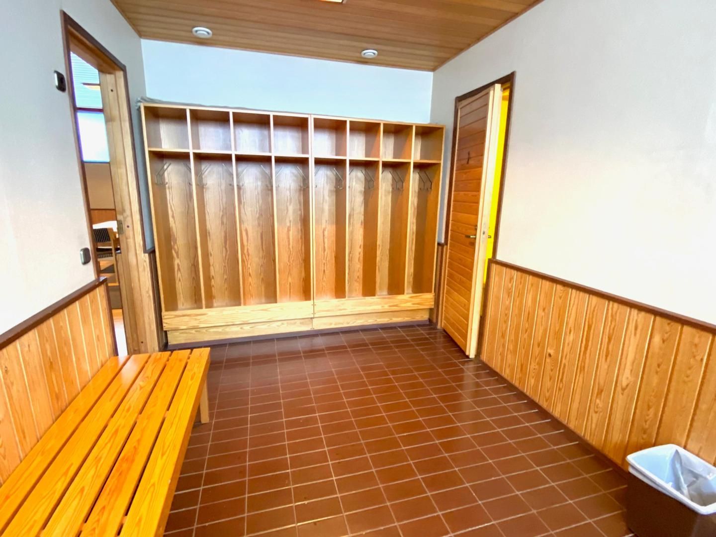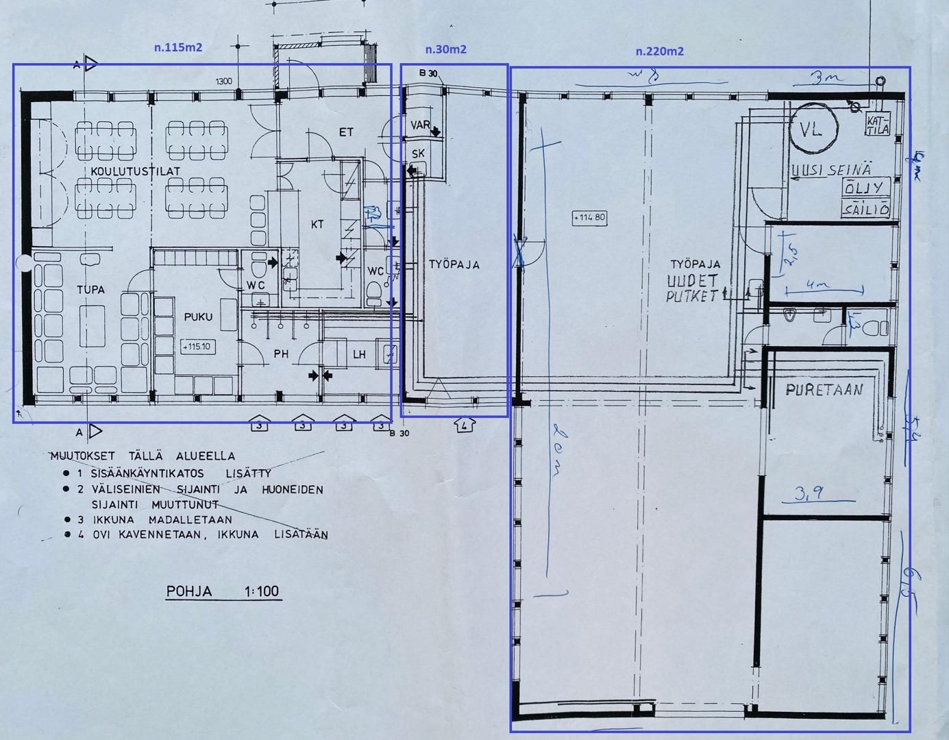 -Saunaosasto/koulutustila/sosiaalitila/toimisto, jonne erillinen sisäänkäynti n. 115 m2. Tämä koostuu eteisestä jossa wc-tilat, keittiöstä, L-mallisesta avotilasta, puku-, pesu- ja saunahuoneesta.