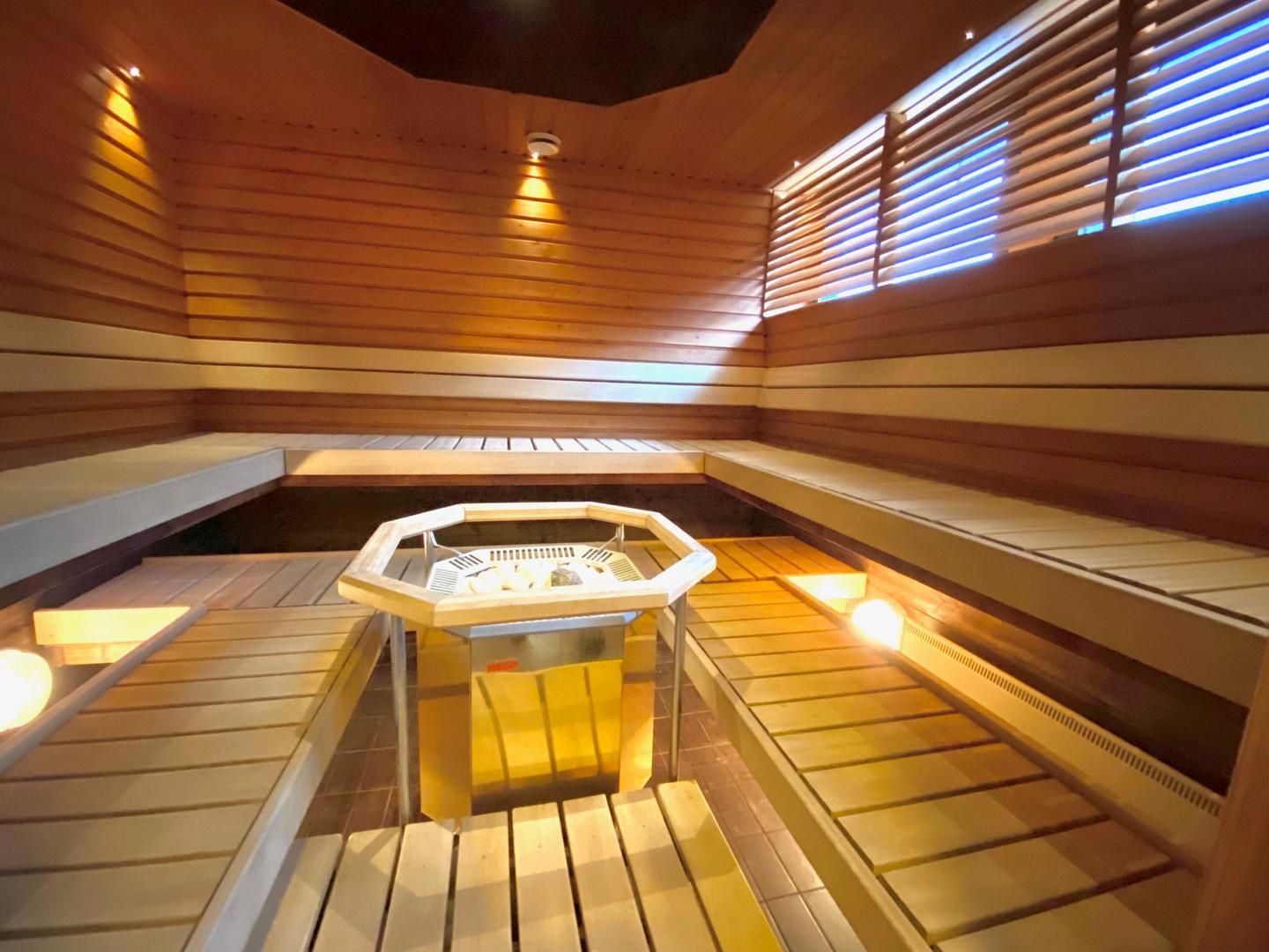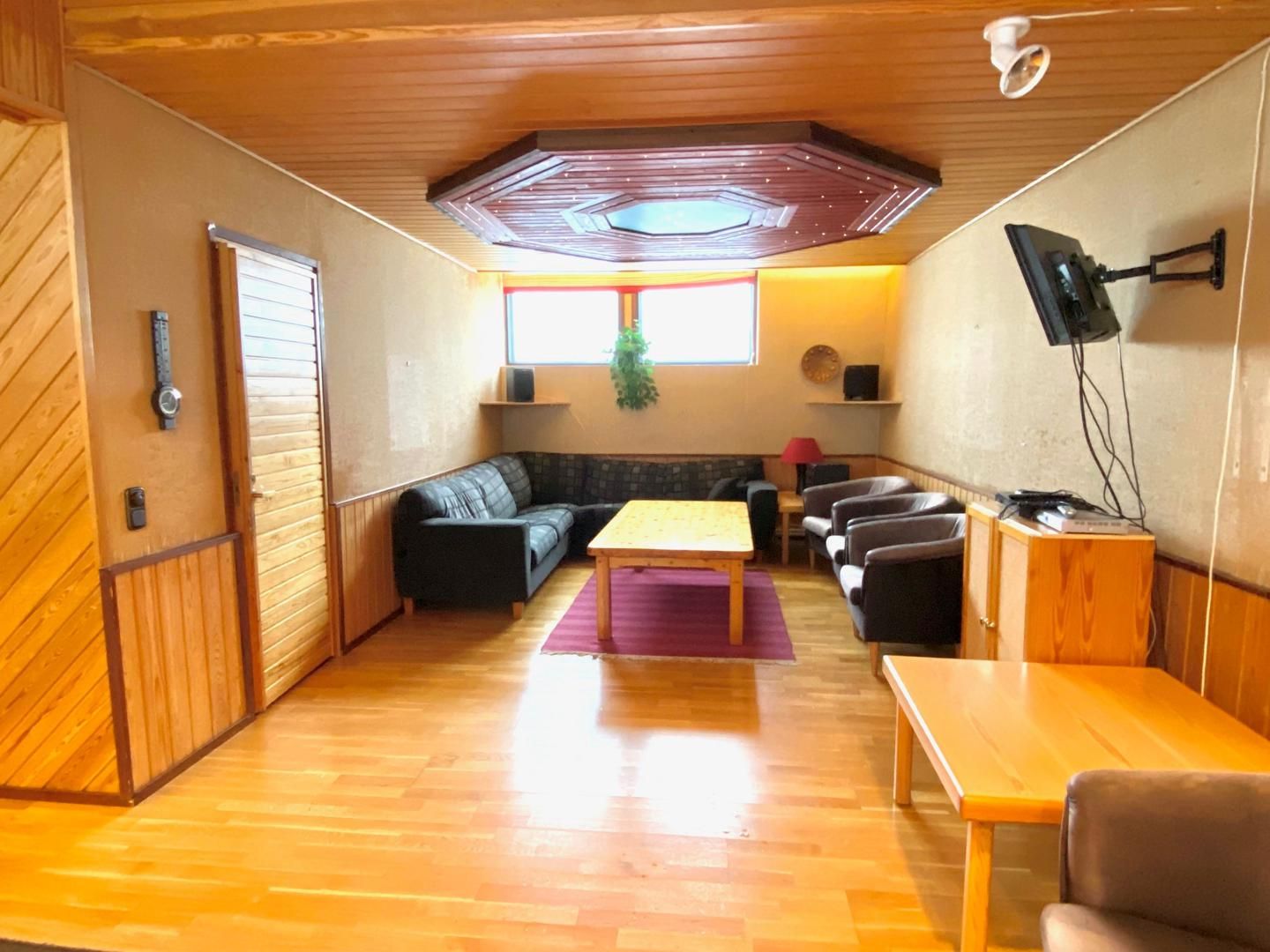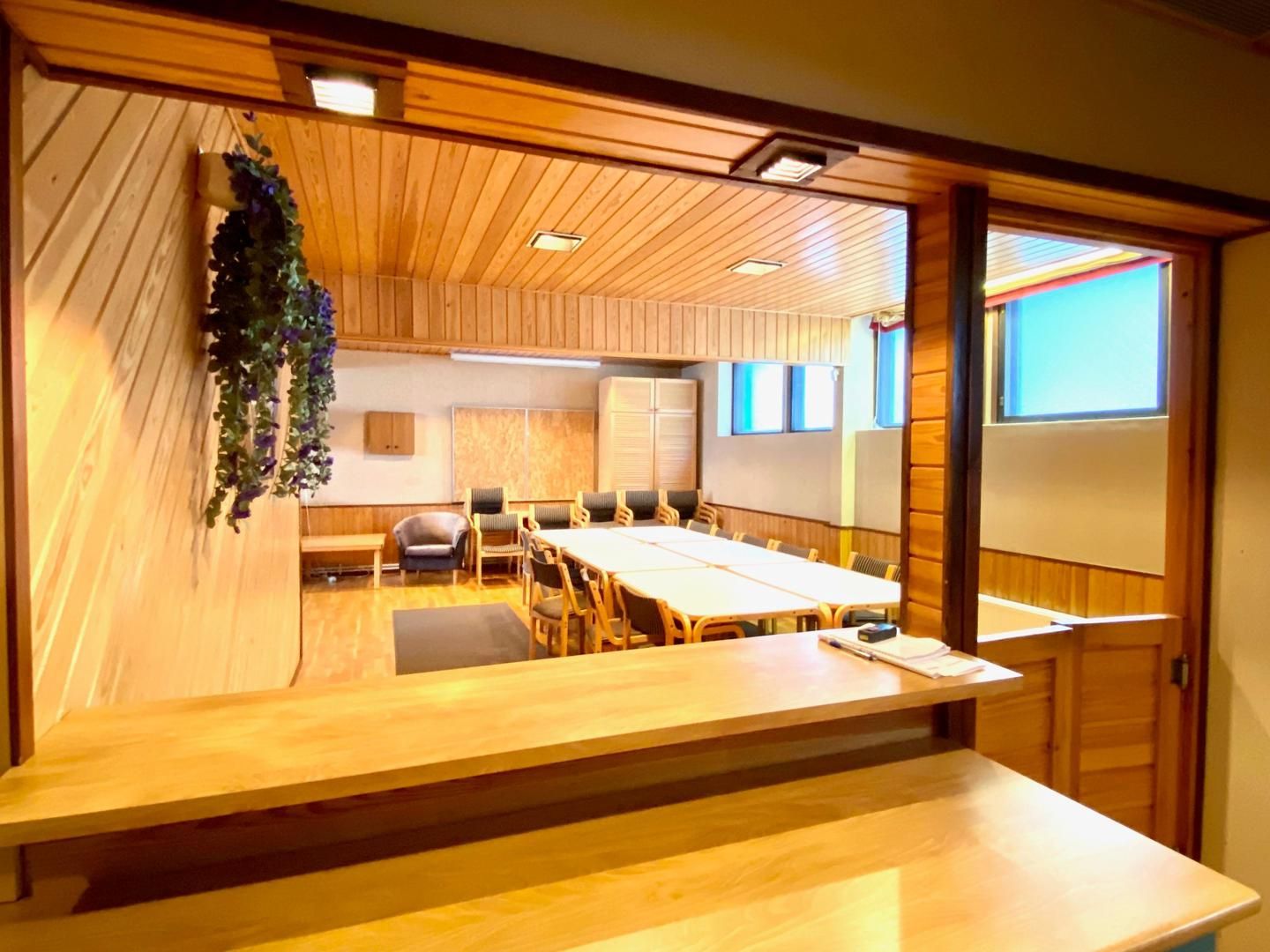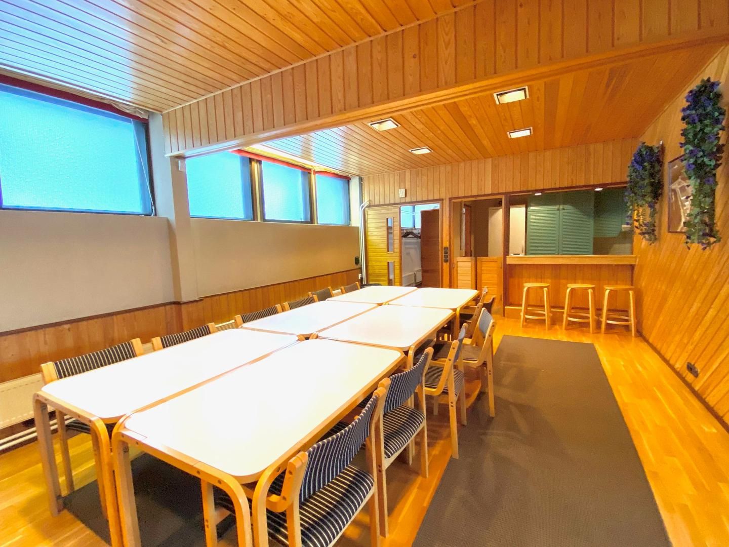 -Saunaosasto/koulutustila/sosiaalitila/toimisto, jonne erillinen sisäänkäynti n. 115 m2. Tämä koostuu eteisestä jossa wc-tilat, keittiöstä, L-mallisesta avotilasta, puku-, pesu- ja saunahuoneesta.