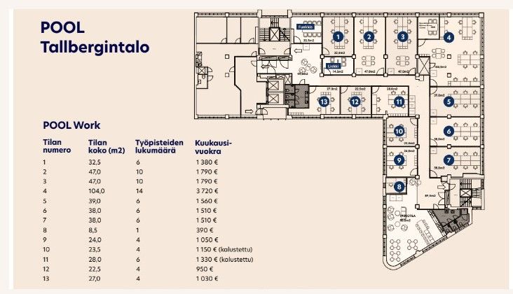 POOL Work -toimistot tarjoavat joustavan ratkaisun moniin tarpeisiin: ne voivat toimia päätoimitilana, satelliittitoimistona, projektityötilana tai innovaatiokeskuksena. Vuokraan sisältyy 24/7 pääsy tiloihin, WLAN-yhteys, sähkö, kahvi ja tee, nimetyn neuvottelutilan sekä keittiötilojen käyttö, ja yhteiskäyttöisten tilojen siivous.