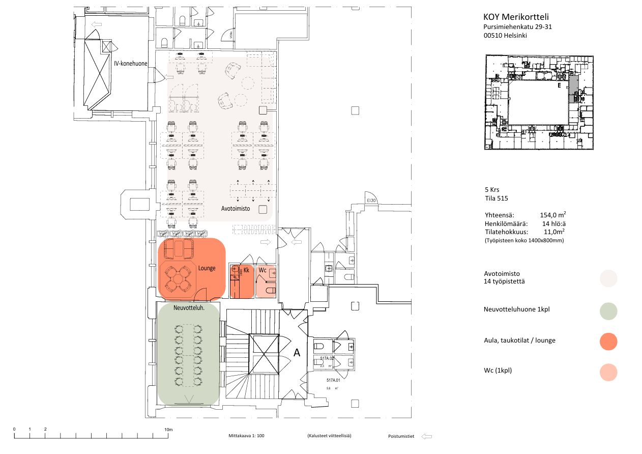 Merikorttelin A-rapussa Punavuoressa sijaitseva 154 m² toimitila tarjoaa inspiroivan ja industrial-henkisen ympäristön yrityksellesi. Viidennessä kerroksessa oleva tila on suunniteltu moderniin työskentelyyn: avotilassa on tilaa 14 työpisteelle ja lisäksi suuri neuvotteluhuone, jossa mahtuu kokoustamaan jopa 12 hengen tiimin kanssa. Tilan varusteluun kuuluu keittokomero ja WC. Merikorttelin ainutlaatuinen tunnelma yhdistettynä Punavuoren urbaaniin fiilikseen tekee tästä toimitilasta täydellisen paikan luovalle ja kasvuhakuiselle yritykselle.