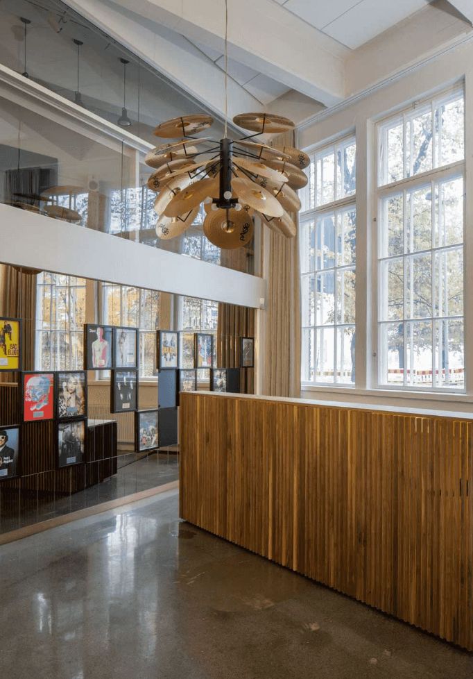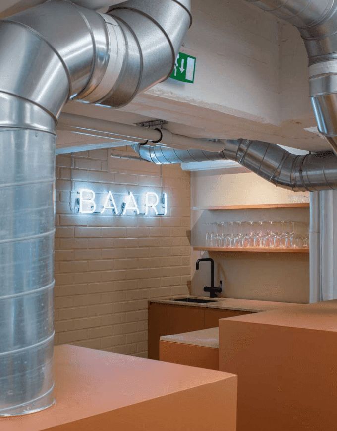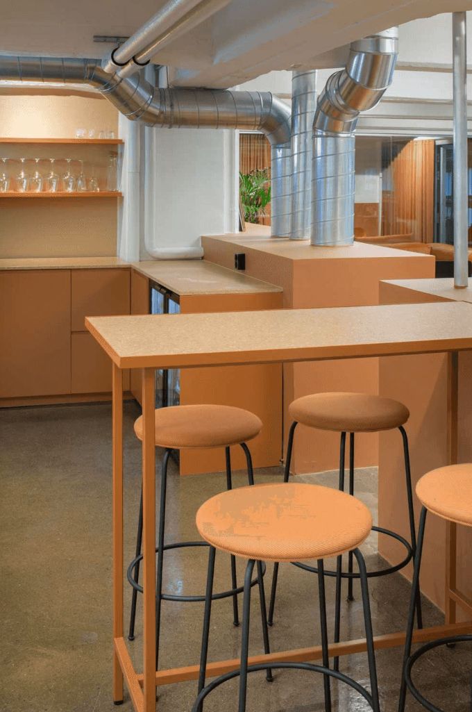 Industrial-henkinen ilme yhdistyy persoonallisiin yksityiskohtiin: kontrastivärit, rouheat pinnat ja tekstiilimatot neuvottelutiloissa luovat tyylikkään ja toiminnallisen kokonaisuuden. Tämä on paikka yritykselle, joka arvostaa näyttävyyttä ja urbaania fiilistä.