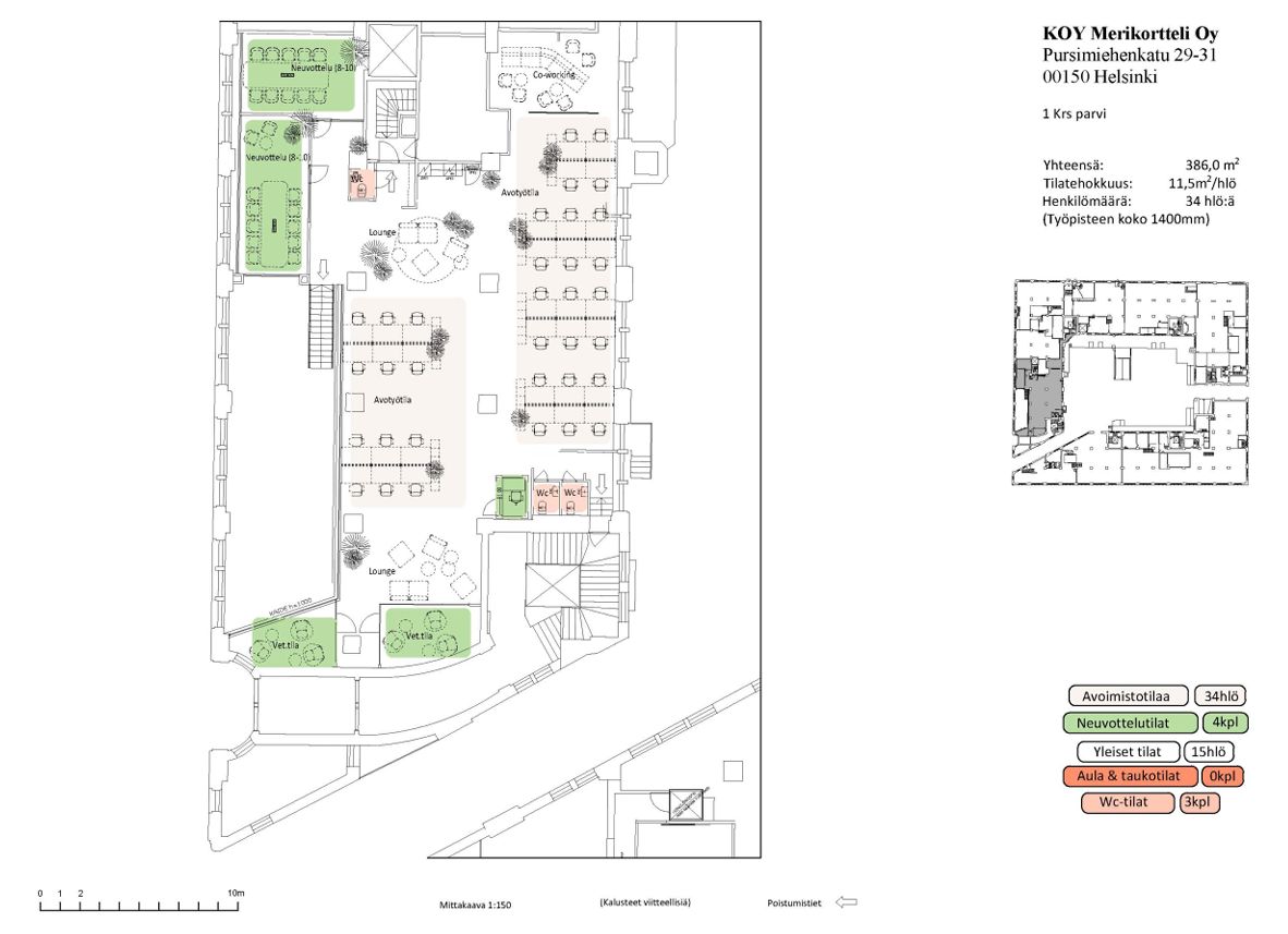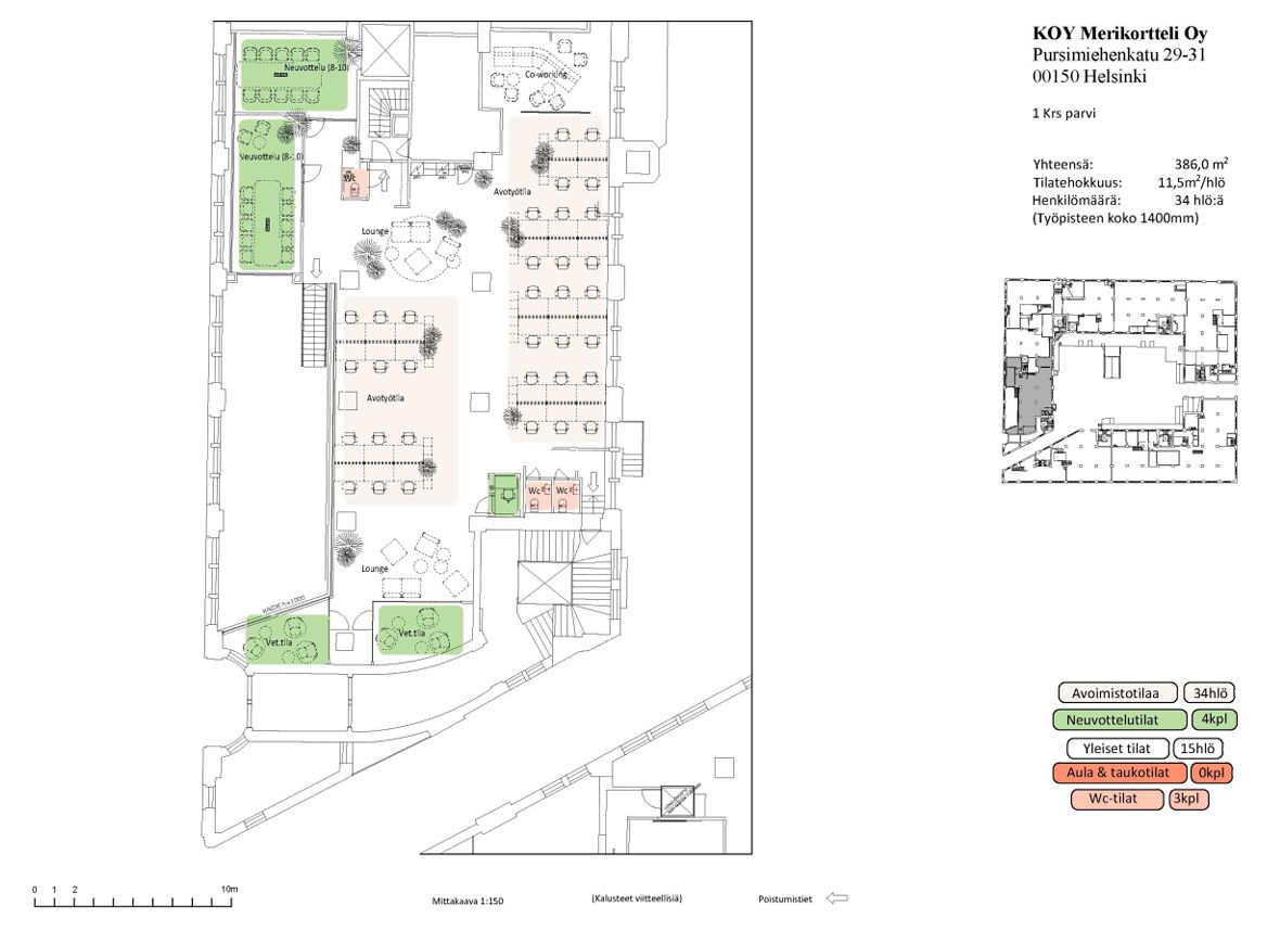 Yläparvi, 386 m², tarjoaa avotilaa, neuvotteluhuoneita, hiljaisia työtiloja sekä kolme WC:tä.