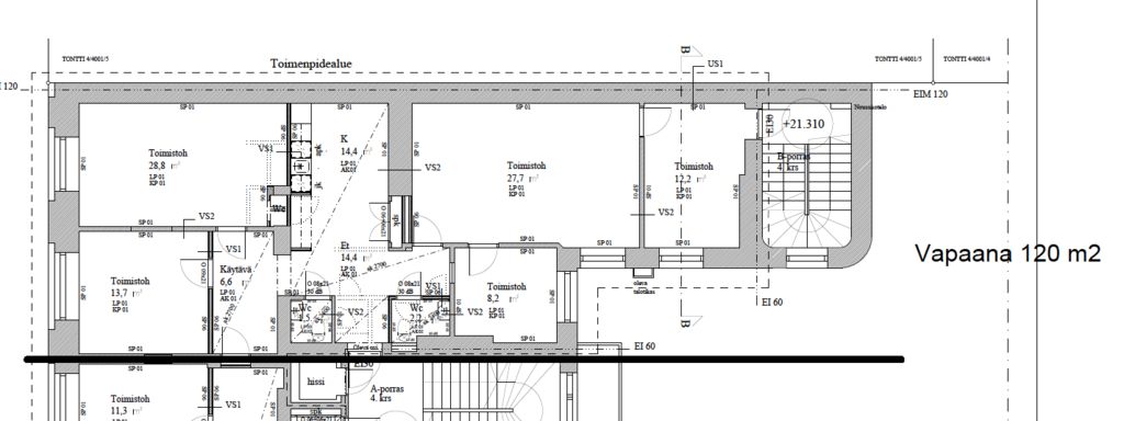Vuokrattava tila on kooltaan 120 m², ja se sijaitsee kiinteistön 4. kerroksessa. Toimistossa on 5 työhuonetta sekä omat keittiö- ja wc-tilat. Toimisto on remontoitu muutama vuosi sitten, ja se on siistissä kunnossa. Toimistossa on kuituvalmiudet.