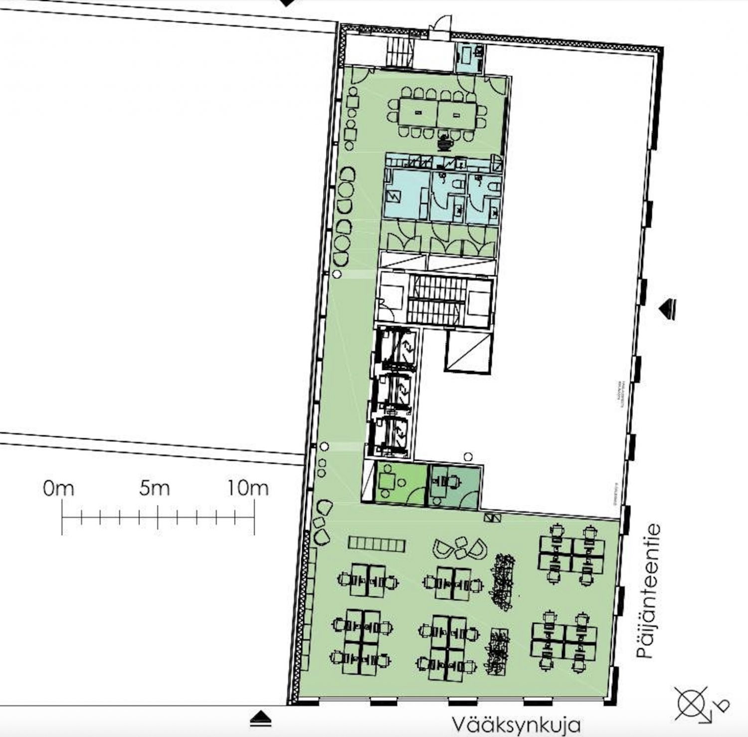 Seitsemännen kerroksen laadukas avotoimistotila Vallilassa, osoitteissa Päijänteentie 12. Rakennuksen kulmassa olevassa toimitilassa on suuret ikkunat kahteen suuntaan.