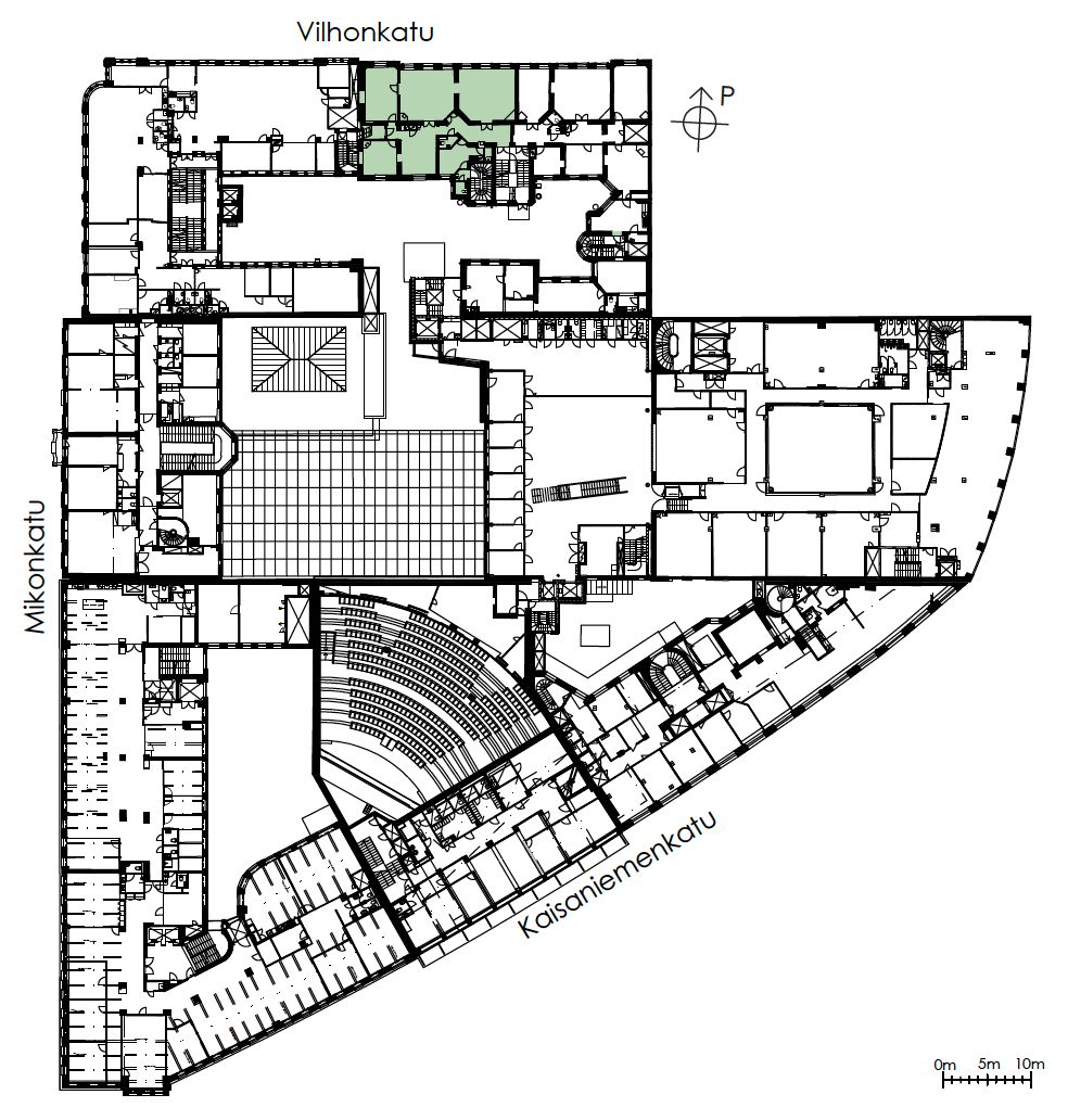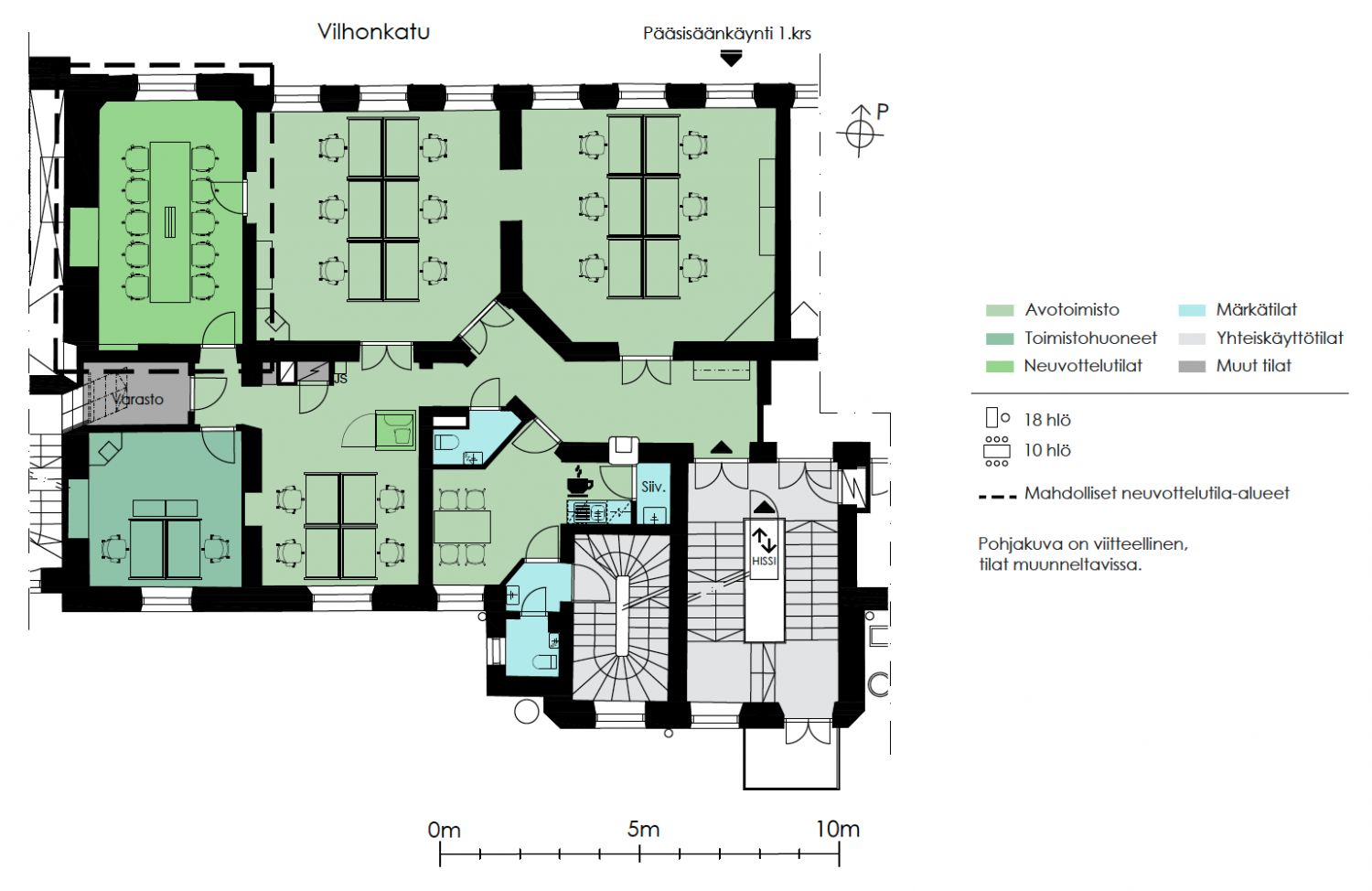 Katutasossa sijaitsevat liiketilat ja ylemmissä kerroksissa toimistotilat. Kiinteistö tarjoaa sekä perinteistä huonetoimistoa että helposti muunneltavaa avotilaa, ja tiloissa on miellyttävän korkea huonekorkeus.