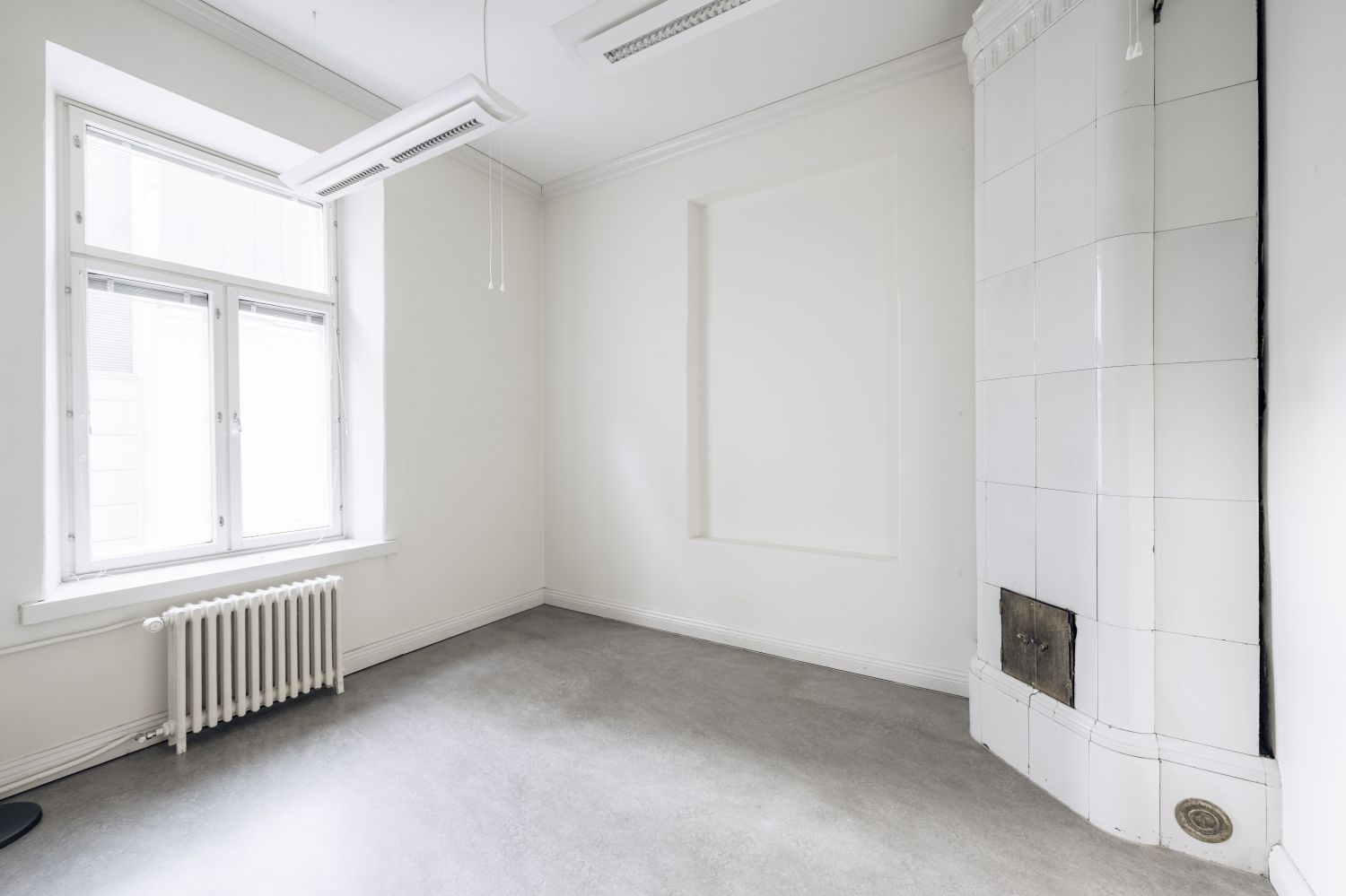 3. kerroksen toimisto, jossa on sekä huoneita että avotilaa. Näkymät sekä Vilhonkadulle että sisäpihalle. Tilassa on hyvä huonekorkeus ja sen erikoisuutena on useampi upea vanha kakluuni.