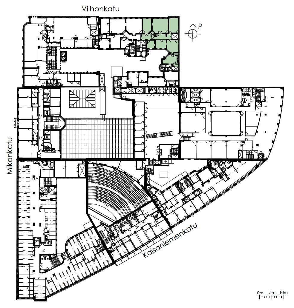 Katutasossa sijaitsevat liiketilat ja ylemmissä kerroksissa toimistotilat. Kiinteistö tarjoaa sekä perinteistä huonetoimistoa että helposti muunneltavaa avotilaa, ja tiloissa on miellyttävän korkea huonekorkeus.
