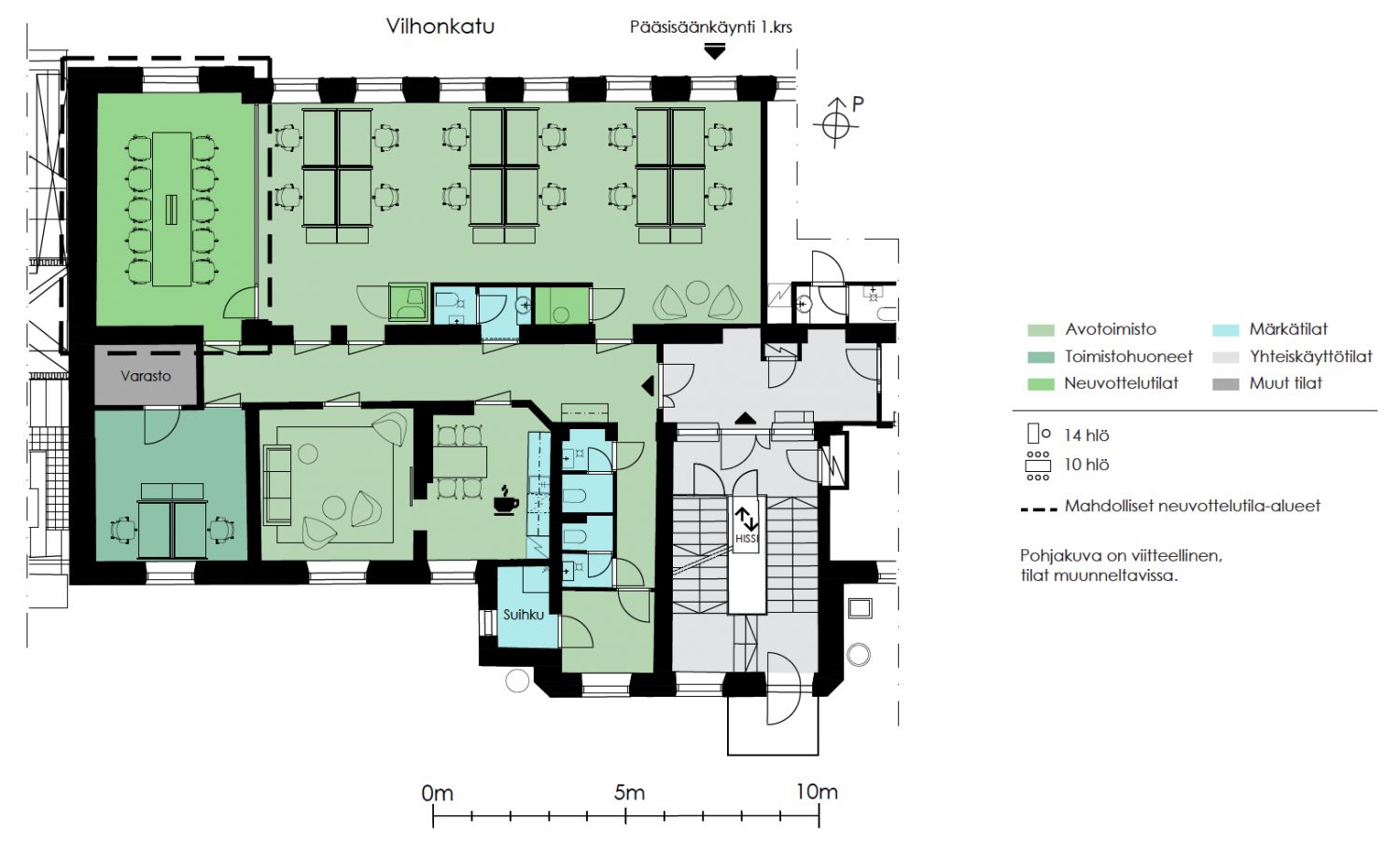 Katutasossa sijaitsevat liiketilat ja ylemmissä kerroksissa toimistotilat. Kiinteistö tarjoaa sekä perinteistä huonetoimistoa että helposti muunneltavaa avotilaa, ja tiloissa on miellyttävän korkea huonekorkeus.