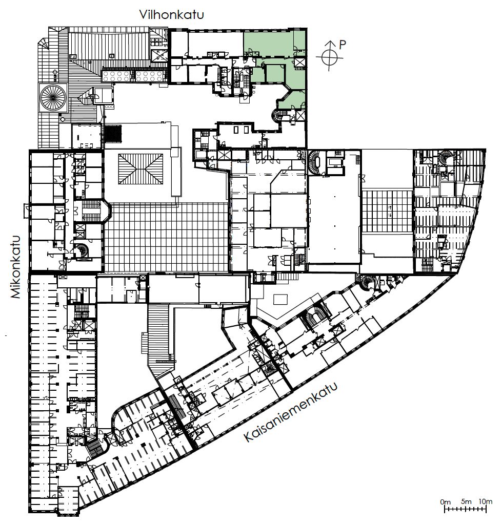 Katutasossa sijaitsevat liiketilat ja ylemmissä kerroksissa toimistotilat. Kiinteistö tarjoaa sekä perinteistä huonetoimistoa että helposti muunneltavaa avotilaa, ja tiloissa on miellyttävän korkea huonekorkeus.