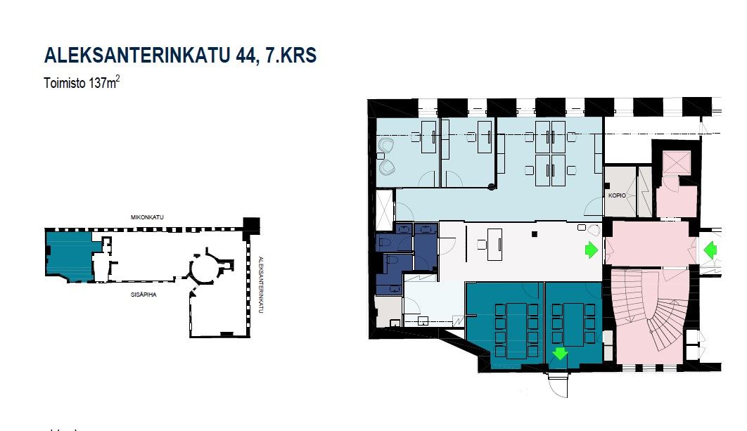 Kiinteistön sisäänkäynti sijaitsee Mikonkadulla, ja toimistotila tarjoaa loistavat puitteet modernille työskentely-ympäristölle kaupungin parhaalla paikalla.