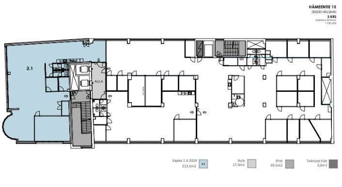 Vuokrattavana 3. kerroksen 222 m2 toimistotila, jossa on huoneita sekä tiimille että teamsille. Avaruutta tuo myös kaareva erkkeri. Talo sijaitsee erinomaisella paikalla Helsingin Sörnäisissä.