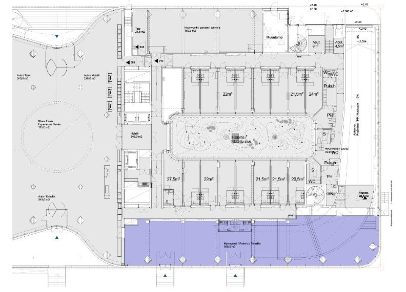 Katutason merenpuoleinen liiketila (pohjakuvassa väritetty alue), joka sopisi hyvin esimerkiksi showroomiksi hienojen maisemien ansiosta. Huom. tilaan ei ole tehty taloteknisiä varauksia ravintola-/kahvilatoiminnalle. Kiinteistö valmistunut kesällä 2024 ja siinä mm. hotelli, ravintola ja kattoterassi.