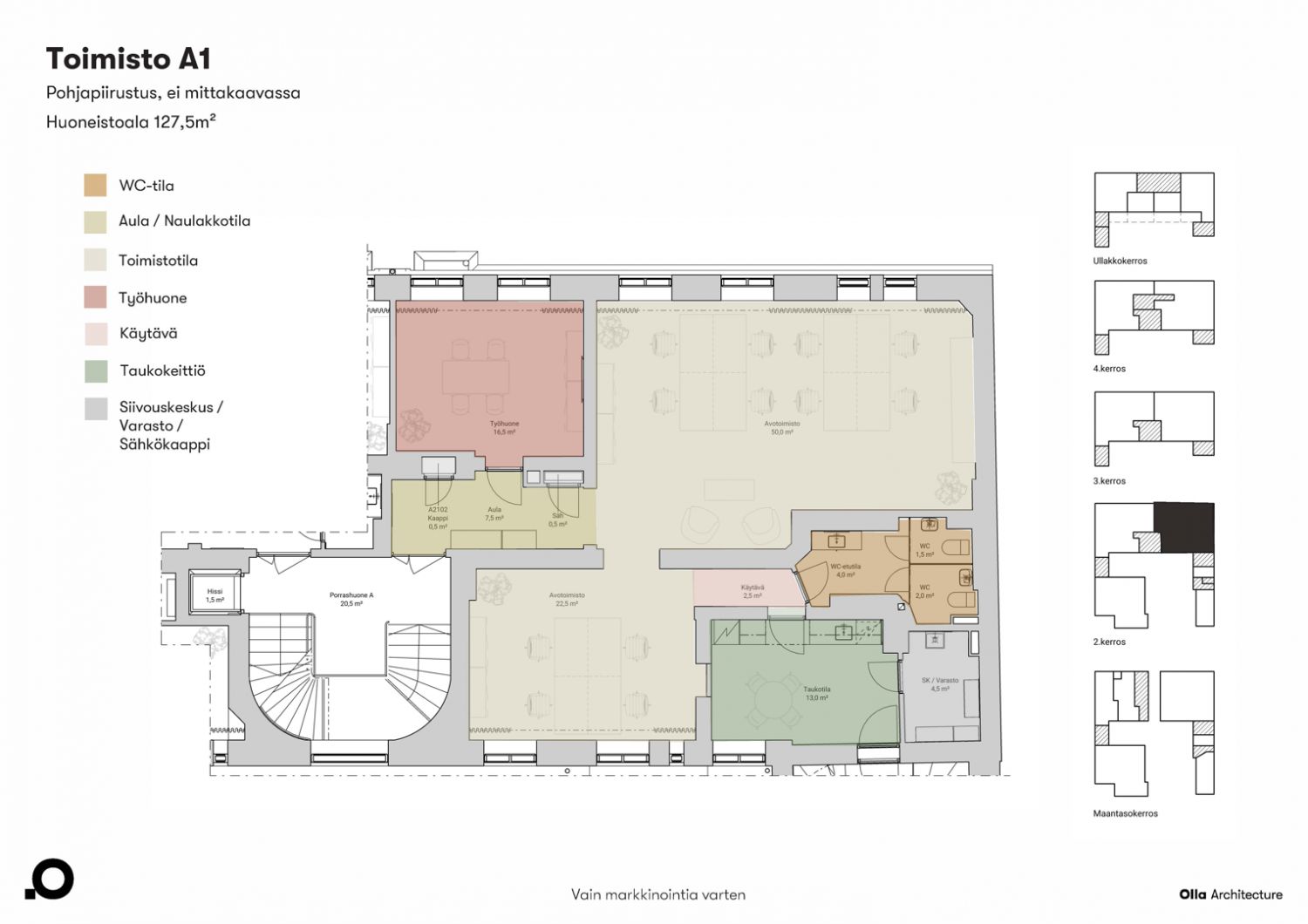 Vuokrattavana 2. kerroksen 127,5 m2 toimistotila. Rakennus valmistunut peruskorjaukseseta 2025. Kaikki tilat remontoitu vanhaan tyyliin ja niissä parkettilattiat. Painovoimainen ilmanvaihto.