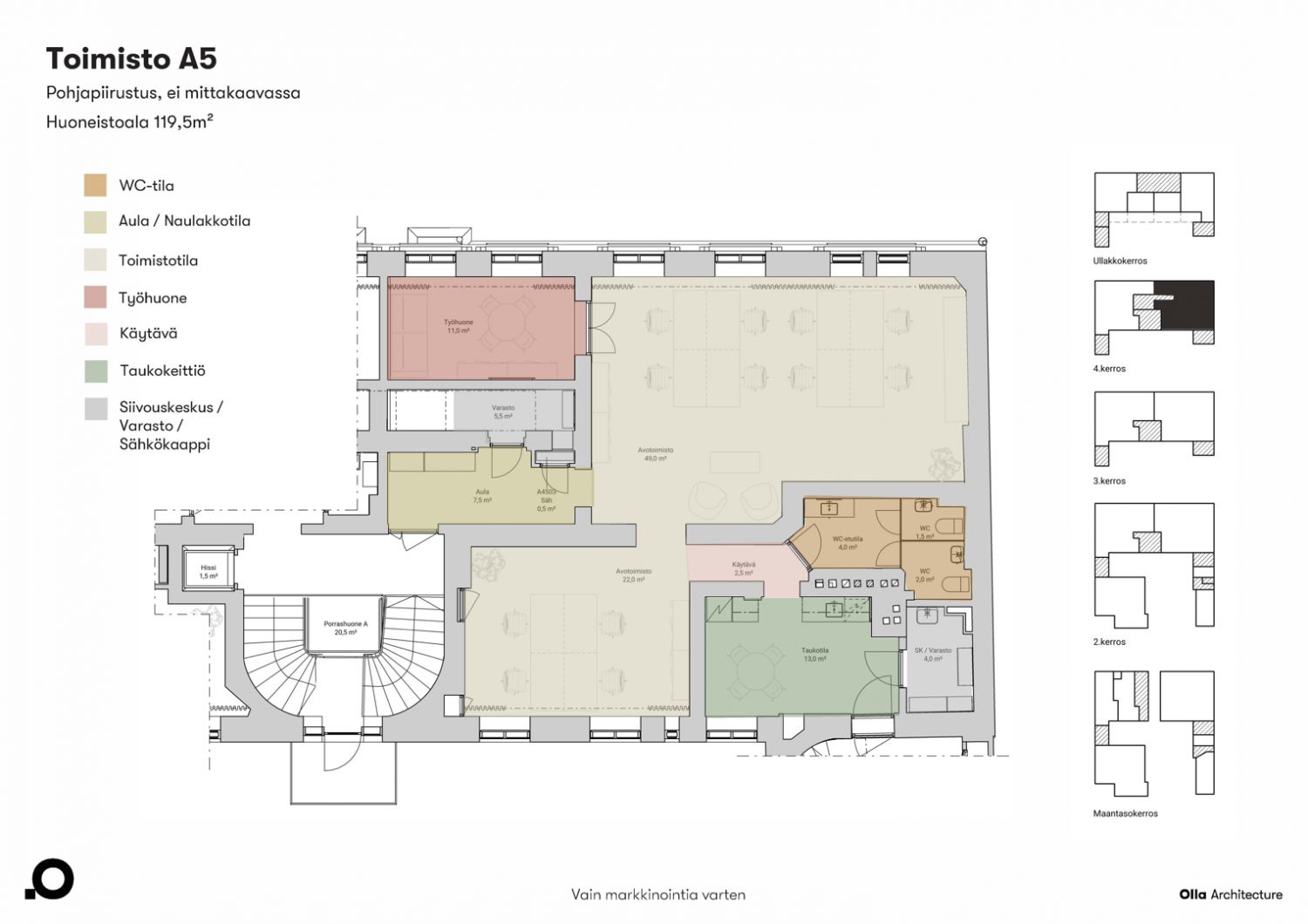 Vuokrattavana 4. kerroksen 119 m2 toimistotila. Rakennus valmistunut peruskorjaukseseta 2025, joten tilat ovat erinomaisessa kunnossa. Kaikki tilat remontoitu vanhaan tyyliin ja niissä parkettilattiat. Painovoimainen ilmanvaihto.