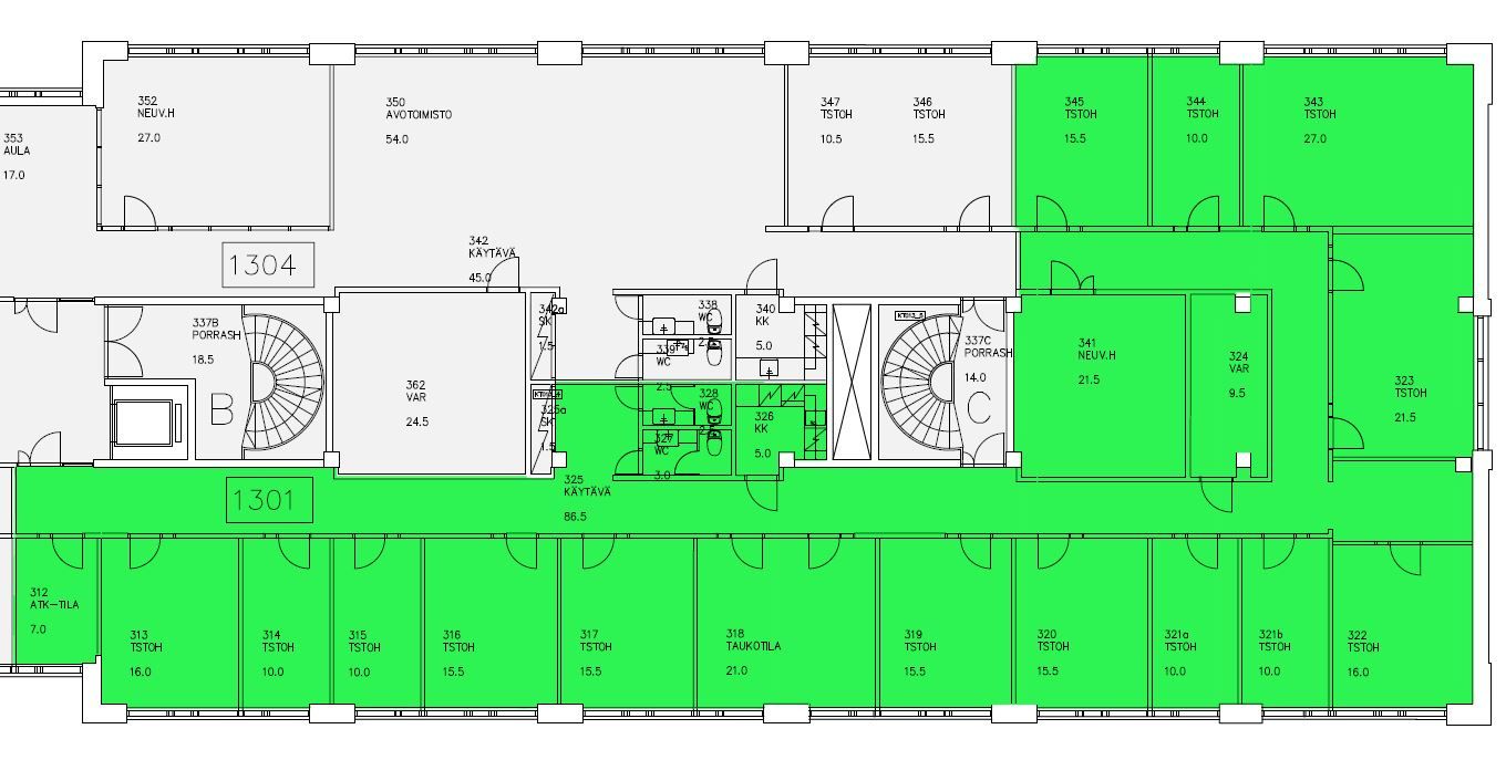 Vuokrattavana peruskuntoinen huonetoimistotila. Pintaremontilla edullista ja muunneltavaa toimistotilaa. Huoneistossa on oma neuvottelutila, sosiaali- ja taukotilat. Tila on muokattavissa asiakkaan tarpeen mukaan. Huoneisto 1301.