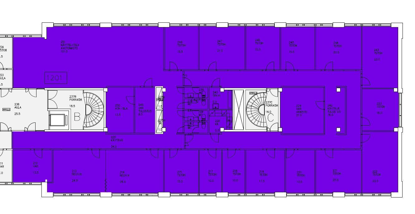 Vuokrattavana toisen kerroksen 602 m2 toimistotila. Pintaremontilla edullista ja muunneltavaa toimistotilaa.