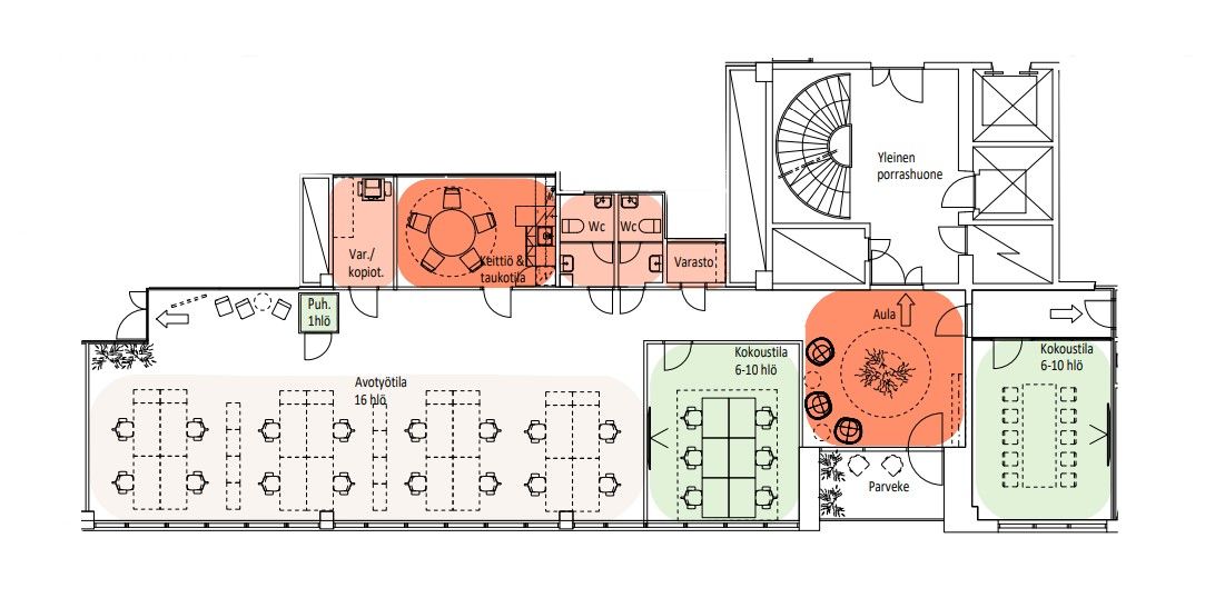 Vuokrattavana ylimmän kerroksen toimisto, jossa on käytössä oma parveke. Tehokas toimisto avotilalla ja kahdella neuvotteluhuoneella.