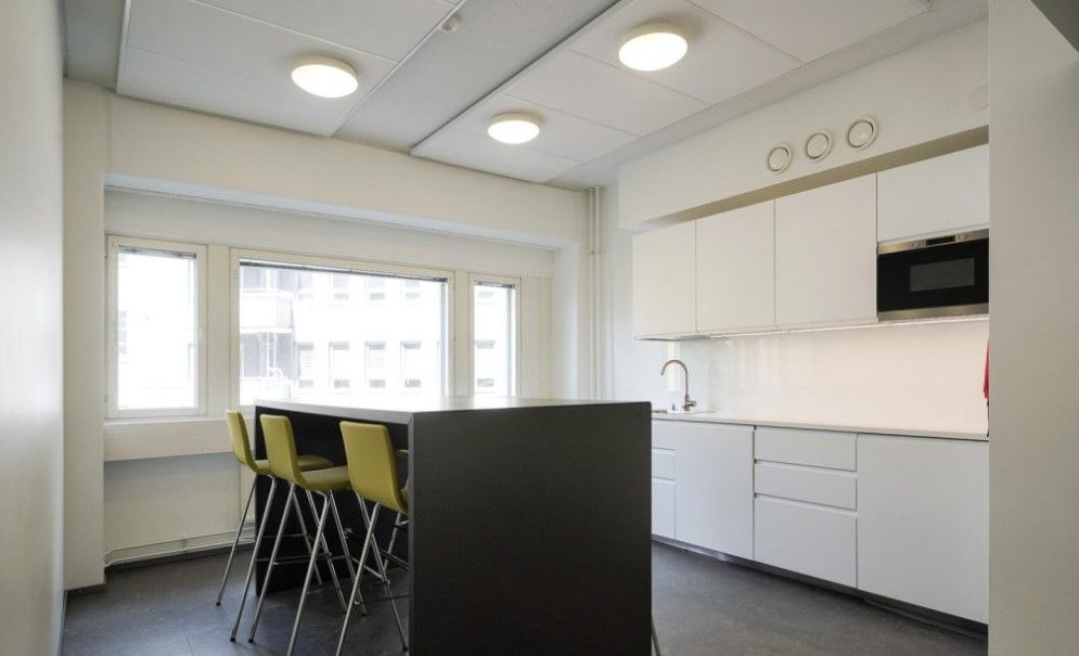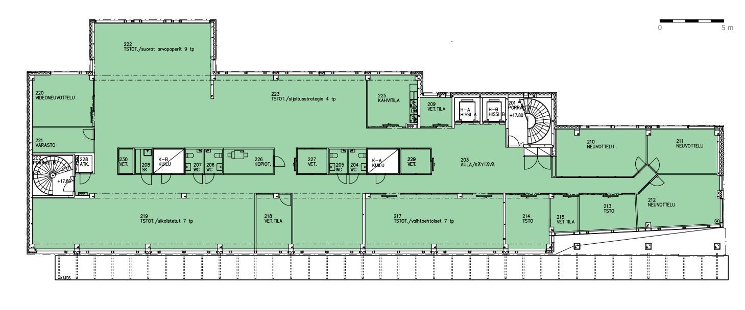 Vuokrattavana 2. kerroksen moderni 616 m2 toimistotila vuonna 2017 remontoidusta kiinteistöstä. Sisävalokuvat ovat esimerkkejä kiinteistön toimitiloista.