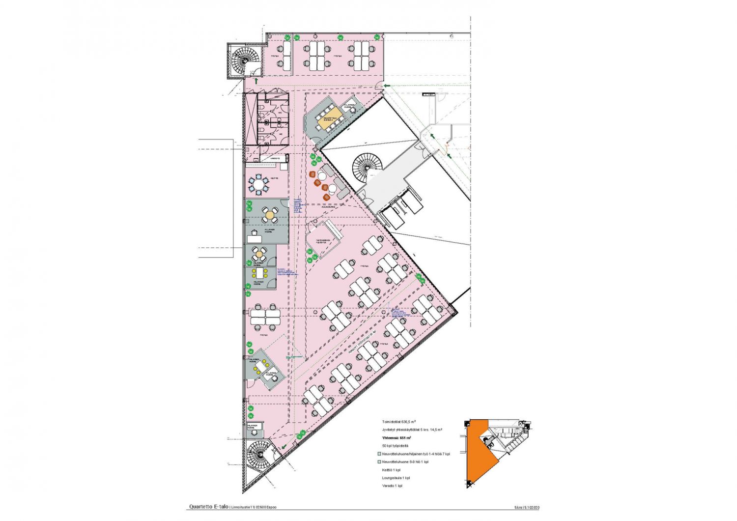 Toimistotila Quartetto Business Park Plus ESTRADE-talossa. Toimiston pinta-ala on 636,5 m2. Jyvitetyt neliöt yhteiskäyttötiloista 14,5 m2. Pinta-ala yhteensä 651 m2.