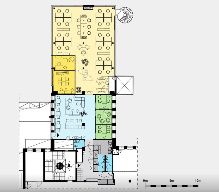 Valoisa sisäpihasiiven toimistotila, josta ei valoa ja avaruutta puutu. Toimistossa on working cafe lounge, kolme kompaktia neuvottelutilaa, avotyöalue, kaksi työhuonetta sekä kolme wc-tilaa ja varasto/kopiointitila. Valokuvat ovat malliesimerkkejä kiinteistön tiloista.