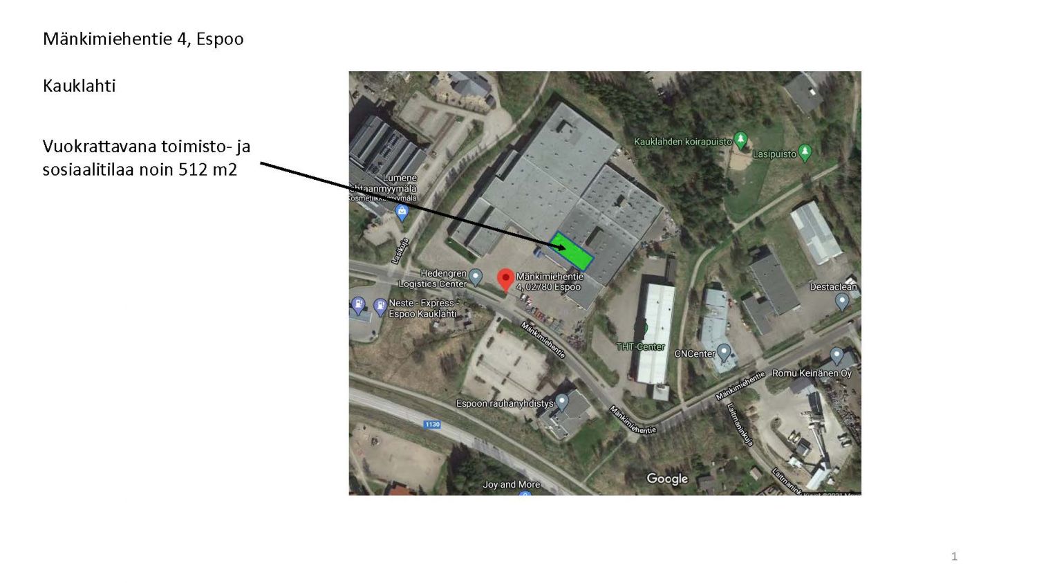 Mänkimiehentie 4 sijaitsee Espoon Kauklahden teollisuusalueella. Vuokrattavana oleva varasto-osa on rakennettu 1997 ja toimisto 1990, jonka jälkeen toimisto on peruskorjattu pari vuotta sitten nykyaikaiseksi. Samaa kiinteistössä toimii myös konevuokraamo ja talotekniikka-alan yritys.