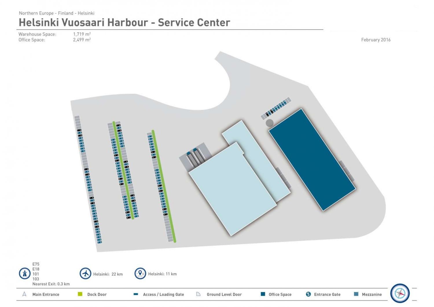 Vuosaaren Service Center on osa vuonna 2008 valmistunutta modernia ja nykyaikaista sataman logistiikkakeskusta. Service Center muodostuu kahdesta eri rakennuksesta, joista satamanpuoleisessa osassa on modernia ja muunneltavaa toimistotilaa ja toisessa toimii satamakoneiden huolto- ja korjauspiste. Kiinteistöllä on valokuituyhteys ja toimistotiloissa on jäähdytys. Kiinteistö sijaitsee Vuosaaren satamassa aivan satamakeskuksen ytimessä, josta on hyvät yhteydet ympäri Suomen. Alueelta on moottoritietasoinen väylä Kehä III:lle ja samalla koko Suomen päätieverkostoon. Logistiikkakeskuksen terminaaleilta ja laitureilta on raideyhteys satamaradan välityksellä Keravan kautta päärataan. Matkaa Turunväylälle (E18) on 30 minuuttia, Hämeenlinnan väylälle (E12) 20 minuuttia, Helsinki-Vantaan lentoasemalle 20 minuuttia ja Lahdenväylälle (E75) 10 minuuttia. Pihalla on runsaasti pysäköintitilaa.