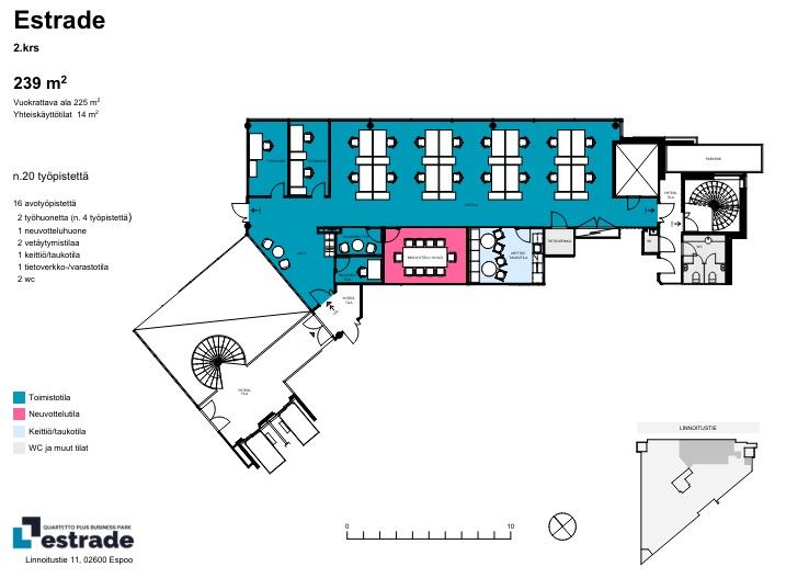 Toimistotila Quartetto Business Park Plus ESTRADE-talossa. Toimiston pinta-ala on 225 m2. Jyvitetyt neliöt yhteiskäyttötiloista 14 m2. Pinta-ala yhteensä 239 m2.