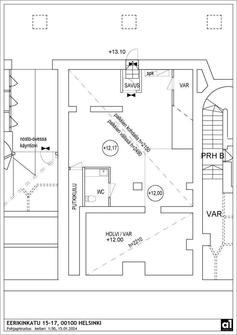 Kiinteistön pihakannen alla autotalli, josta on suora kulkuyhteys kellarikerroksen tilaan. Tilassa on uusittu sähkökeskus ja sähkösyöttö sekä tele/data -kaapelointi. IV-koneet omalla kanavalla kiinteistön ulkopuolella rakennuksen katolle. Ruokaravintolakäyttöön soveltuva.