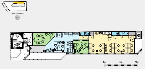 Vuokrattavana 2. kerroksen 195 m2 toimistotila. Toimistotila sijaitsee alkuperäistä rakennusta täydentävässä uudemmassa pihasiipirakennuksessa. Sisäpihalta katsottuna tila sijaitsee 1. kerroksessa. Toimitossa on avotilaa, työ-/tiimihuone, taukokeittiö, neuvotteluhuone, kaksi wc:tä. Tila muuntuu helposti myös huonetoimistoksi. Tilan ikkunat avautuvat kiinteistön omalle viihtyisälle sisäpihalle.