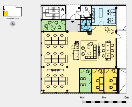 Toimistotila (3A1), johon mahtuu vähintään 28 työpistettä, avotilassa 18 työpistettä ja 6 hot deskiä, lisäksi kolme vetäytymistilaa. Kahvilakeittiön yhteydessä moderni taukotila sekä viihtyisä kohtaamistila – sujuvaan yhteistyöhön ja virkistäviin taukoihin. Tiloista avarat näkymät kohti itää ja etelään ja vastapäistä rakennusta. Kaikissa tiloissa mm. tekstiilipalamatot, modernit vaaleat taukokeittiöt vinyylilankkulattioin sekä energiatehokas led-valaistus. Sähkömaksu 0,65€/m2/kk. Aulapalvelumaksu erikseen.