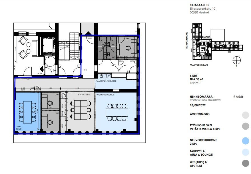 Siltasaari 10 -hanke. Siltasaari 10 puhaltaa elämää Hakaniemeen. Siltasaari 10 on sekoitus luovia yrityksiä, startupeja, kolmannen sektorin toimijoita, jaettua työtilaa ja huippumodernia, energiatehokasta toimisto-arkkitehtuuria. Tyylikäs sisäänkäynti toimistoihin ja ravintolatiloihin kulttuurihistoriallisesti arvokkaasta Siltasaarenkatu 8-10 kiinteistöstä. Kohde tarjoaa laadukasta toimistotilaa, jossa palvelut saavutettavissa kuivin jaloin kohteen 2.kerroksen toiminnallisen sydämen kautta. Katutasossa PT-kauppa, retail-tilaa sekä kahviloita ja ravintoloita. 2. kerroksessa laadukas ravintola-keskittymä, toimistojen welcome desk, yhteiskäyttöisiä neuvottelu-, tapahtuma- ja projektityötiloja sekä co-working alue. Laadukkaat ja helppokäyttöiset pyörävarastot sekä sosiaalitilat. Autopaikkoja kahdessa kellarikerroksessa. Toimistotilat ovat jaettavissa pienempiin yksiköihin tai yhdistettävissä isommiksi kokonaisuuksiksi joko samaan tasoon tai sisäportaalla kerroksien välillä. Yhteen tasoon saatavilla jopa 2855 m2 ja 317 työpistettä. Vuokrattavaa toimistotilaa yhteensä yli 16.000 m2. Kohteen saneeraus on valmistunut alkuvuonna 2022 historiaa ja ympäristöä kunnioittaen.