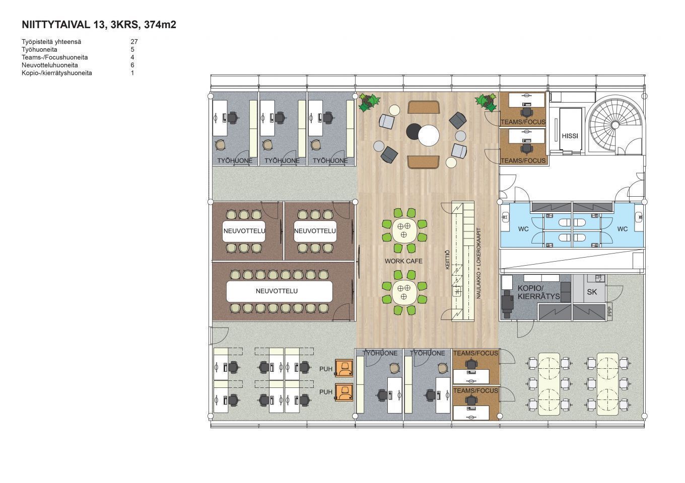 Modernia jäähdytettyä toimistotilaa vuonna 2002 rakennetussa kiinteistössä. Kiinteistössä on aulapalvelu, lounasravintola ja vuokrattavia kokoustiloja sekä ensimmäisessä kerroksessa että neljännessä kerroksessa sijaitsevalla saunaosastolla.