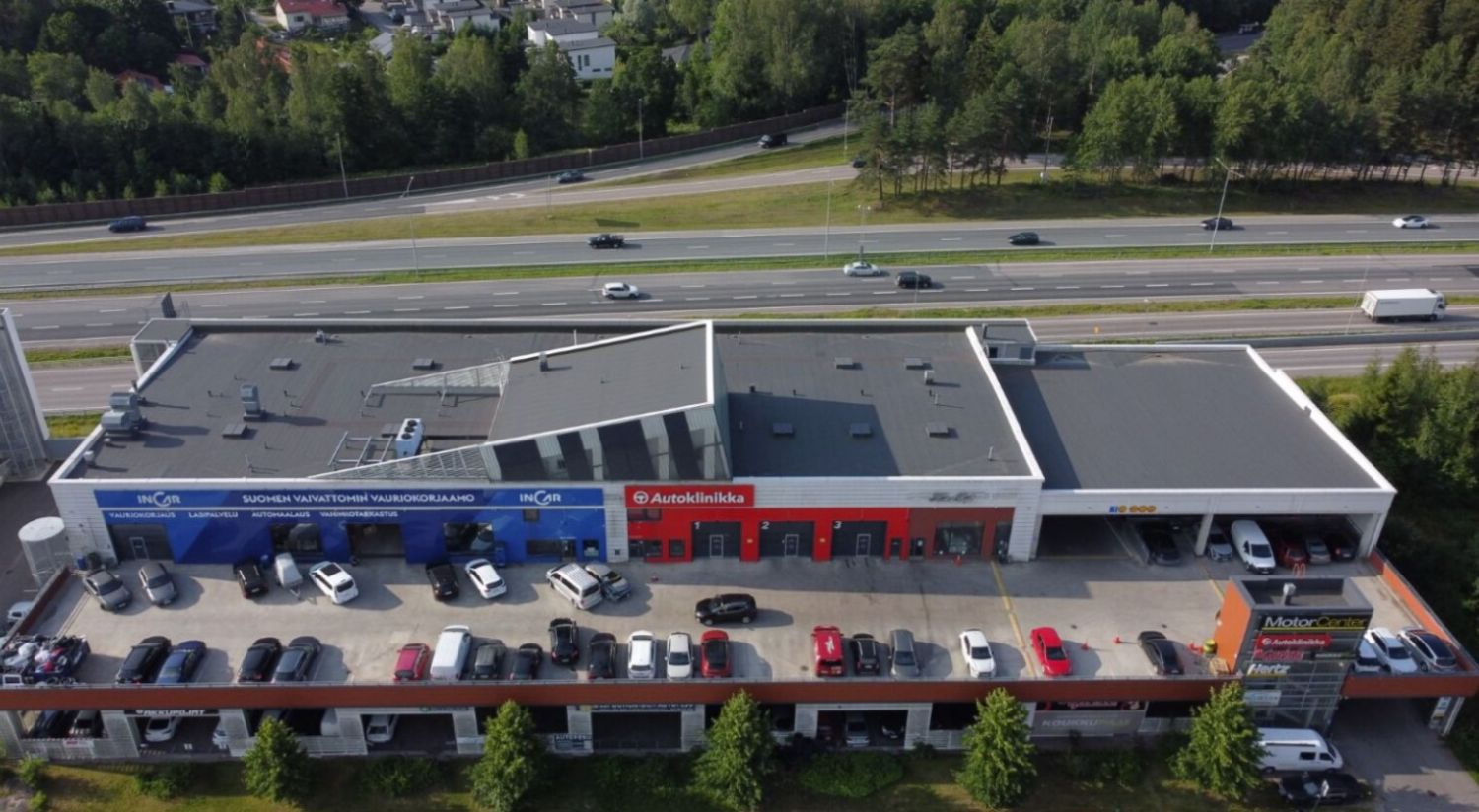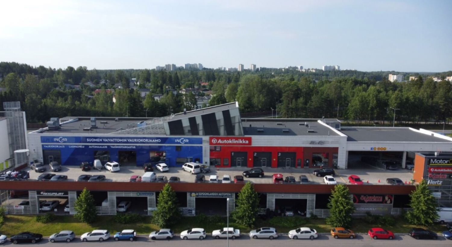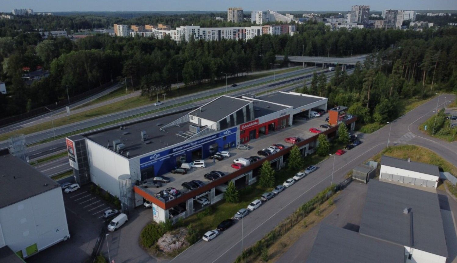 Autopalveluihin keskittynyt kiinteistö näkyvällä paikalla Espoossa, Länsiväylän varressa.