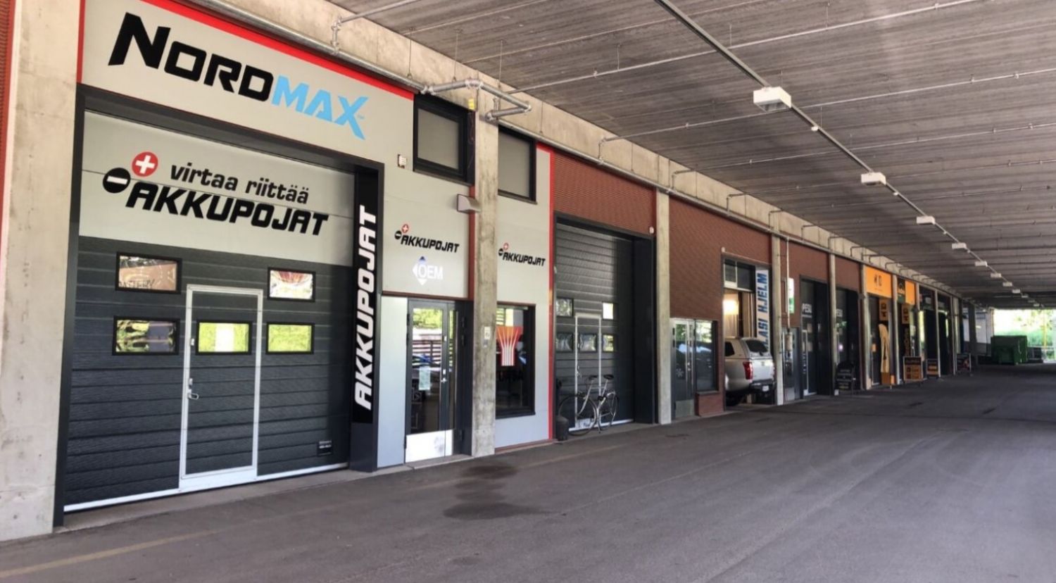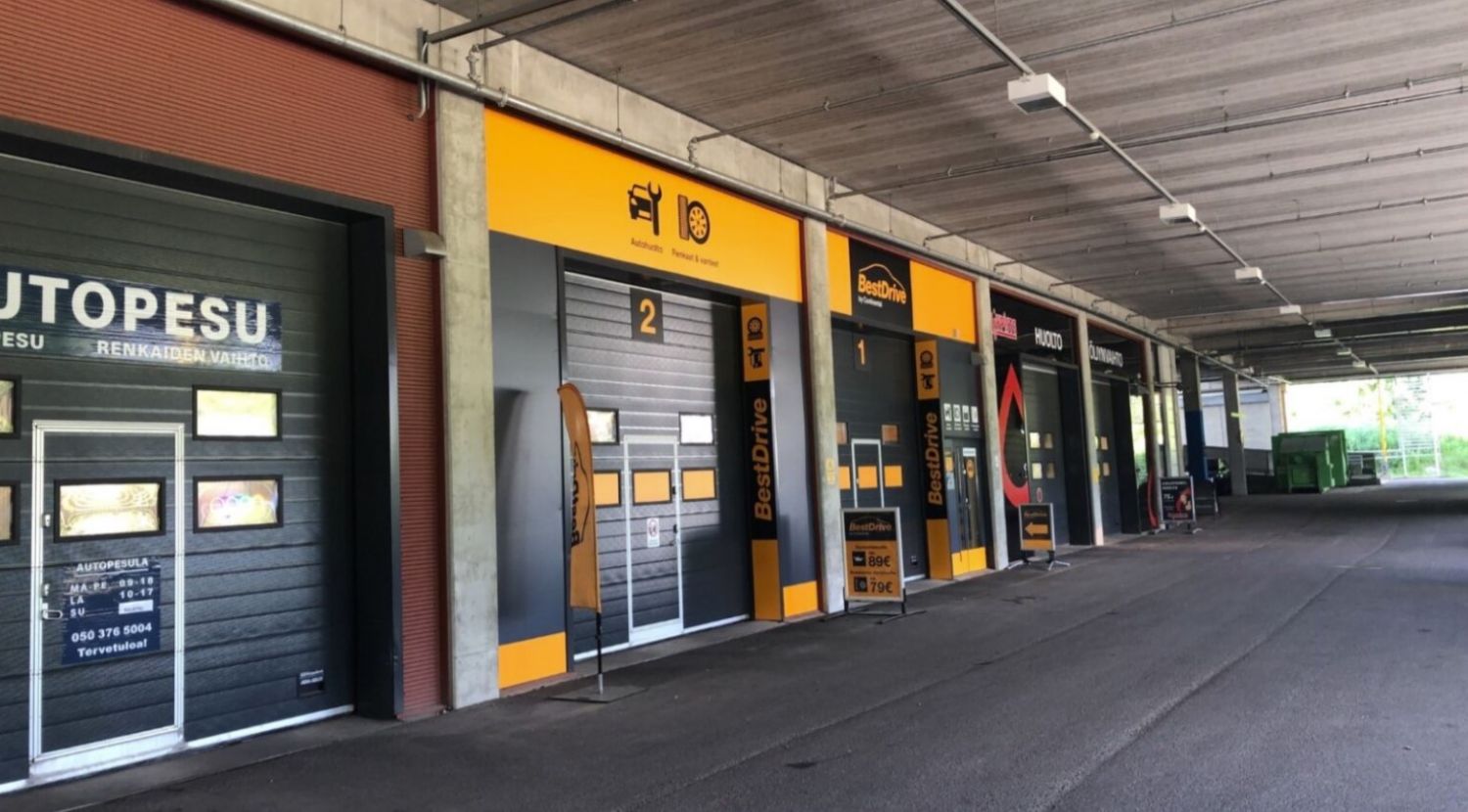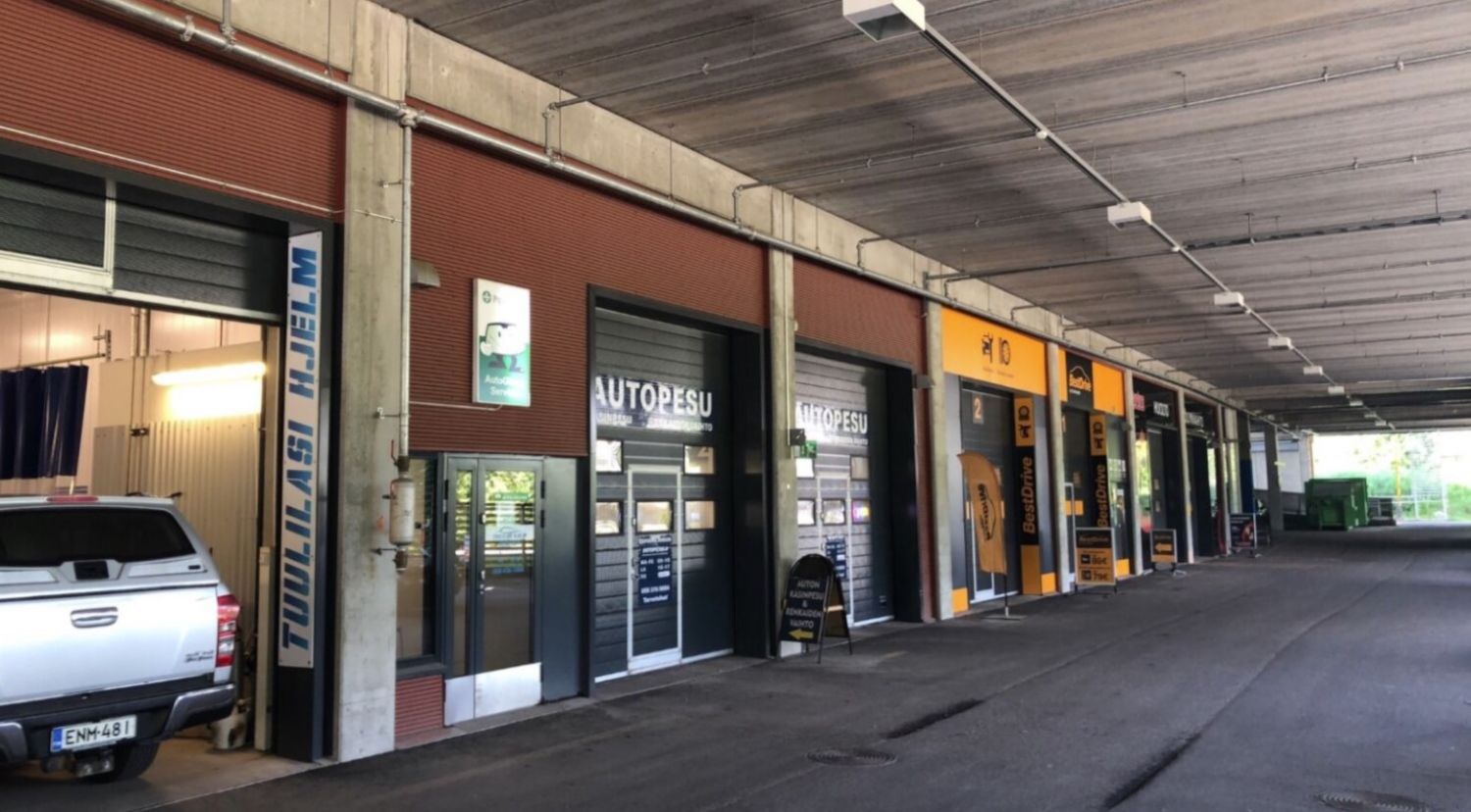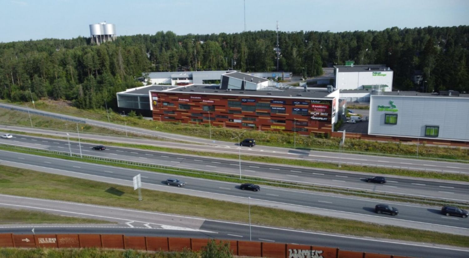Autopalveluihin keskittynyt kiinteistö näkyvällä paikalla Espoossa, Länsiväylän varressa.